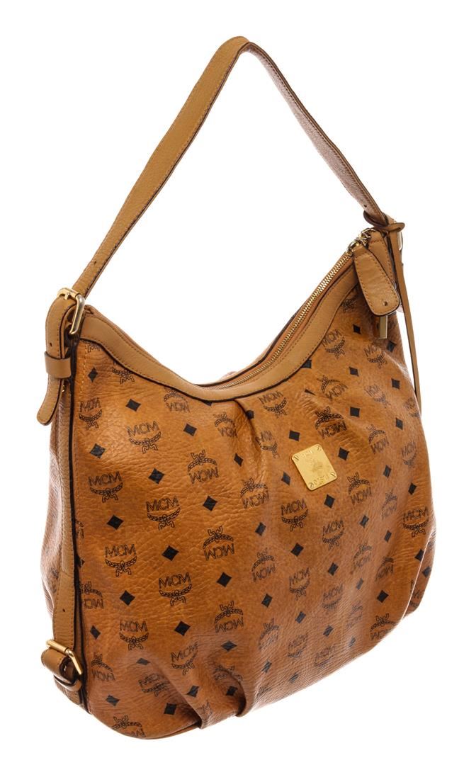 MCM Brown Canvas Leather Hobo Bag. All available information is listed in the description and shown in the photos. MCM Brown Canvas Leather Hobo Bag with gold-tone hardware, leather trim, single adjustable shoulder strap, leather trim embellishment, twill lining & three interior pockets, zip closure at top. Height: 10", Width: 12.5", Depth: 4.5" / 25.4 x 31.75 x 11.43 CM