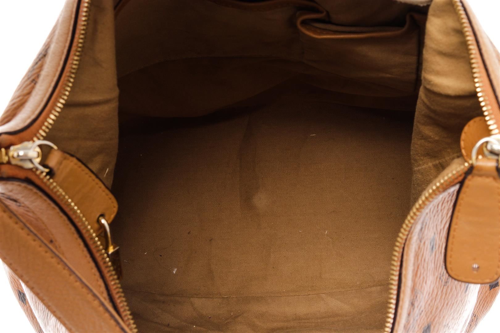 MCM Brown Canvas Leather Hobo Bag. All available information is listed in the description and shown in the photos. MCM Brown Canvas Leather Hobo Bag with gold-tone hardware, leather trim, single adjustable shoulder strap, leather trim embellishment, twill lining & three interior pockets, zip closure at top. Height: 10", Width: 12.5", Depth: 4.5" / 25.4 x 31.75 x 11.43 CM