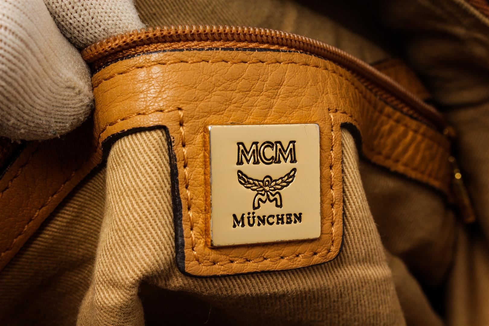 MCM Brown Canvas Leather Hobo Bag. All available information is listed in the description and shown in the photos. MCM Brown Canvas Leather Hobo Bag with gold-tone hardware, leather trim, single adjustable shoulder strap, leather trim embellishment, twill lining & three interior pockets, zip closure at top. Height: 10", Width: 12.5", Depth: 4.5" / 25.4 x 31.75 x 11.43 CM