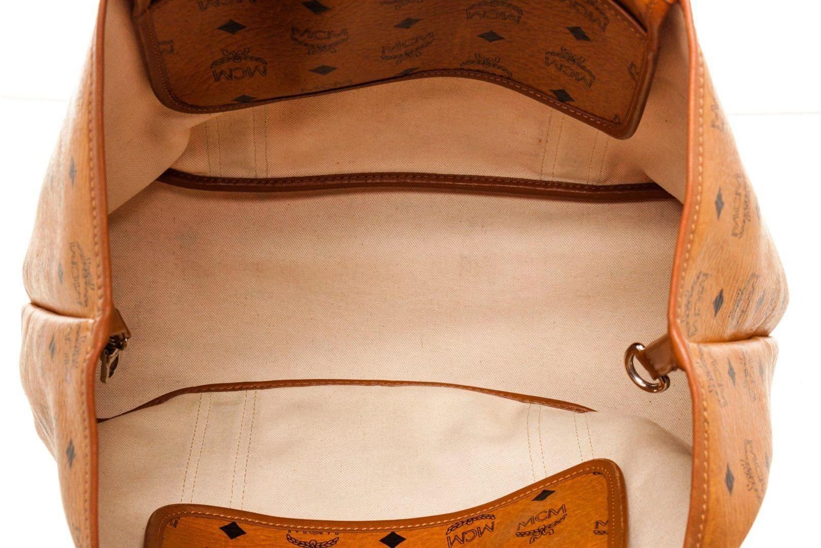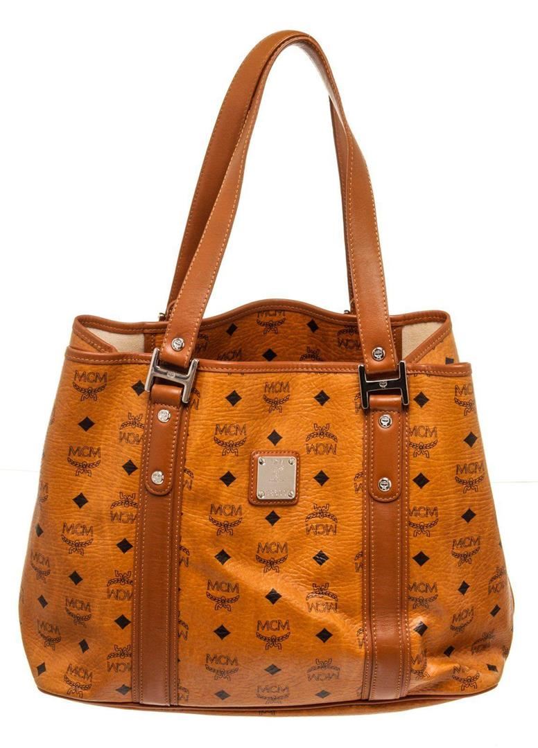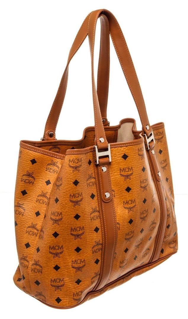 MCM Brown Canvas Leather Shopper Tote Bag with canvas leather, silver-tone hardware, interior flap pockets, canvas lining, dual top handles, flap closure.