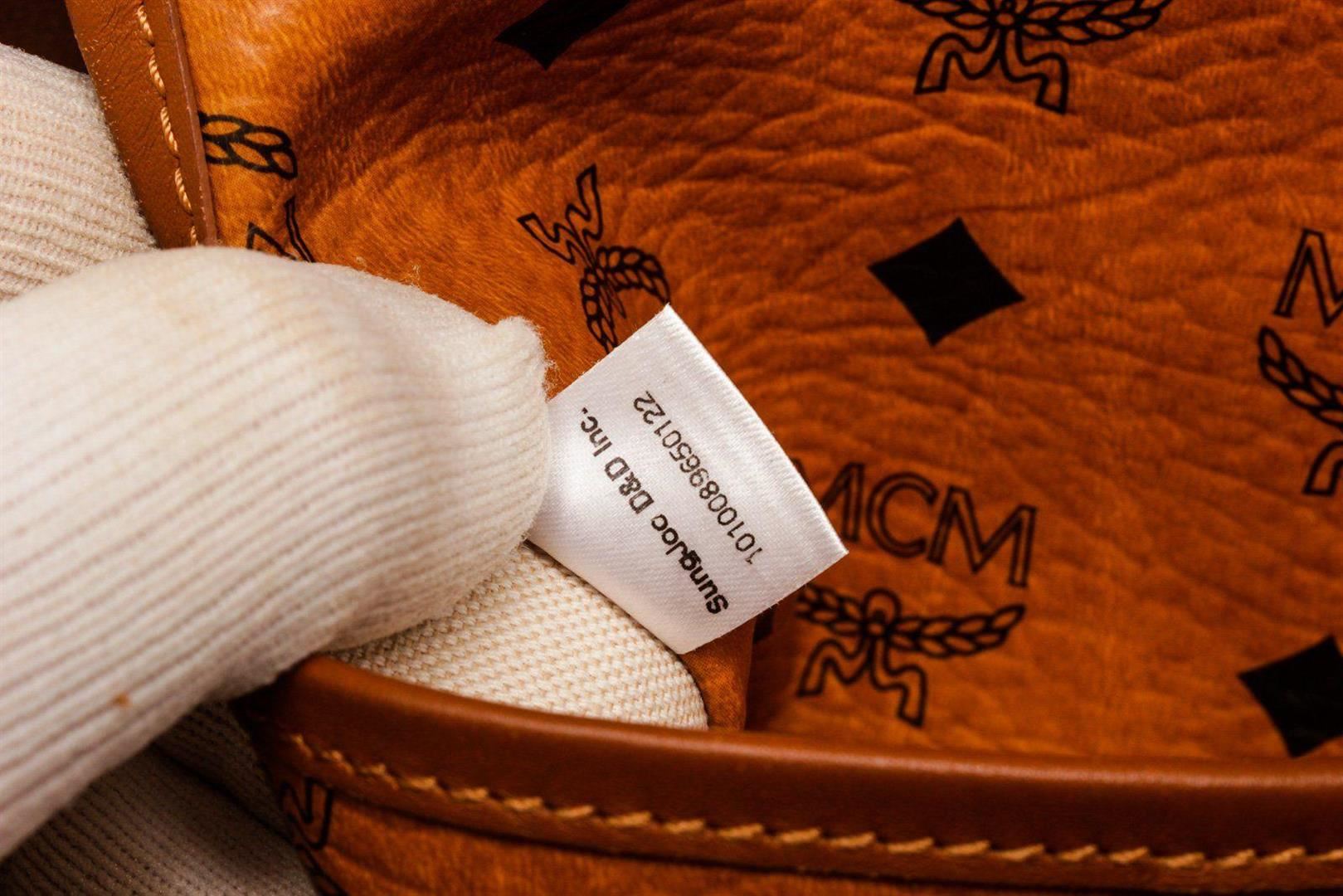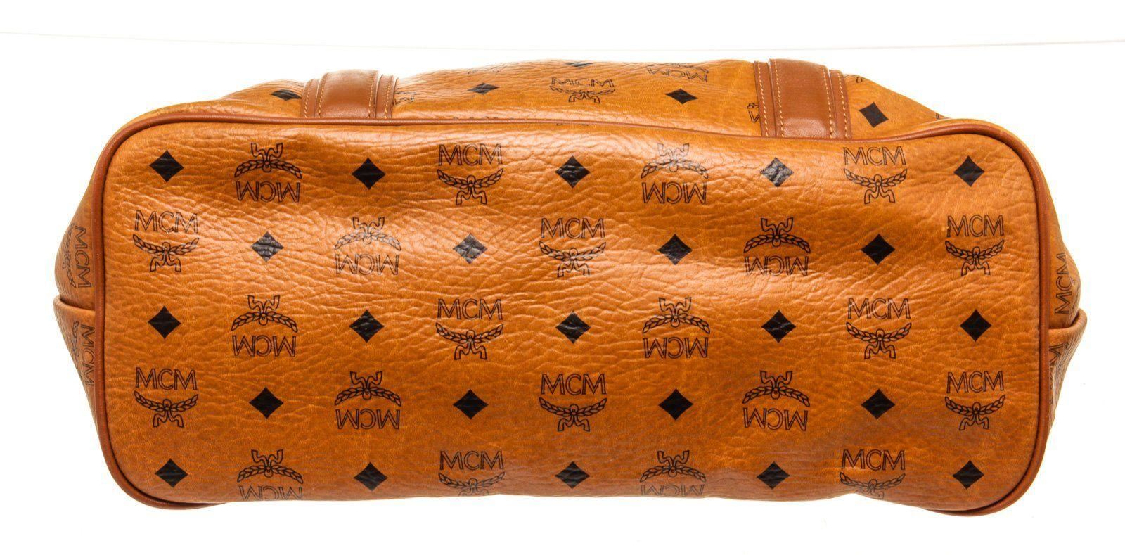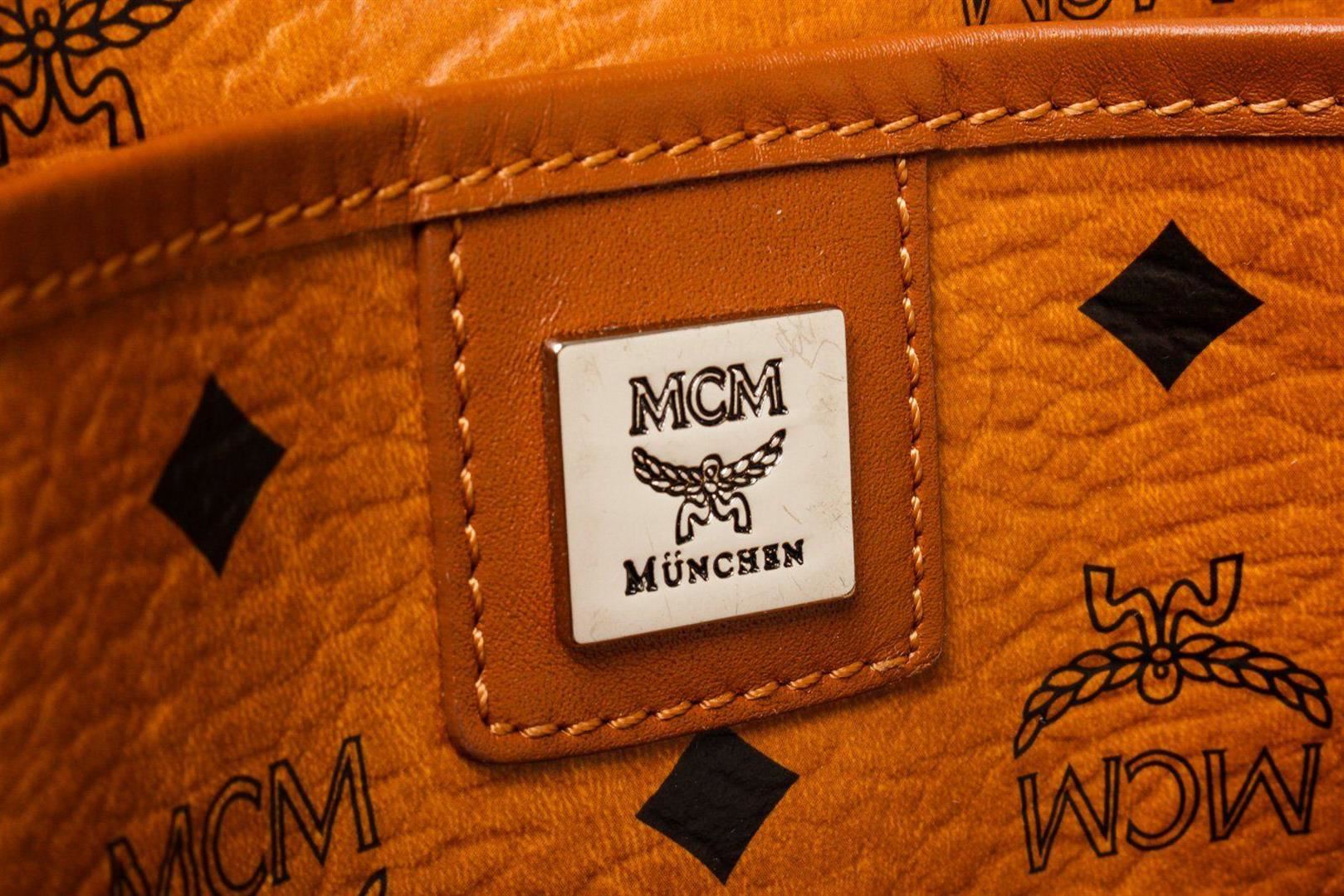 MCM Brown Canvas Leather Shopper Tote Bag with canvas leather, silver-tone hardware, interior flap pockets, canvas lining, dual top handles, flap closure.