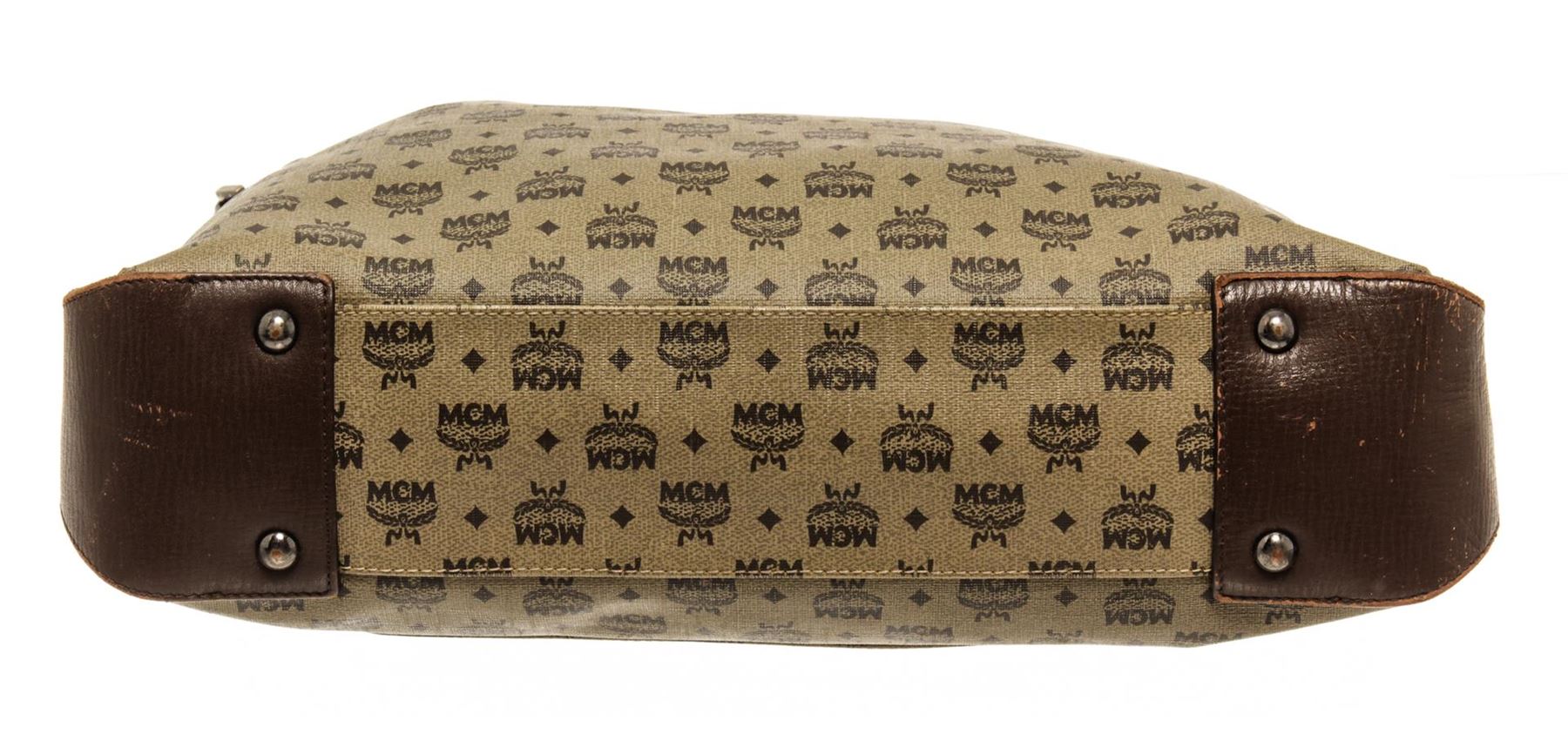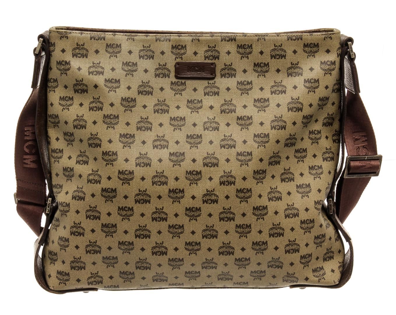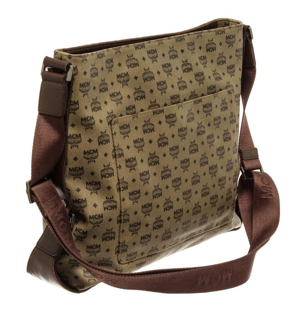 One MCM Brown Coated Canvas Crossbody Bag. Item is sold AS-IS. All available information is listed in the description and shown in the photo. MCM Brown Coated Canvas Crossbody Bag with Brown coated canvas crossbody bag with leather trim, silver-tone hardware, interior slip pockets; one with zip closure, adjustable shoulder strap, and top zipper closure. 10.5"L x 2.25"W x 10"H / 26.67 x 5.715 x 25.4 Cm