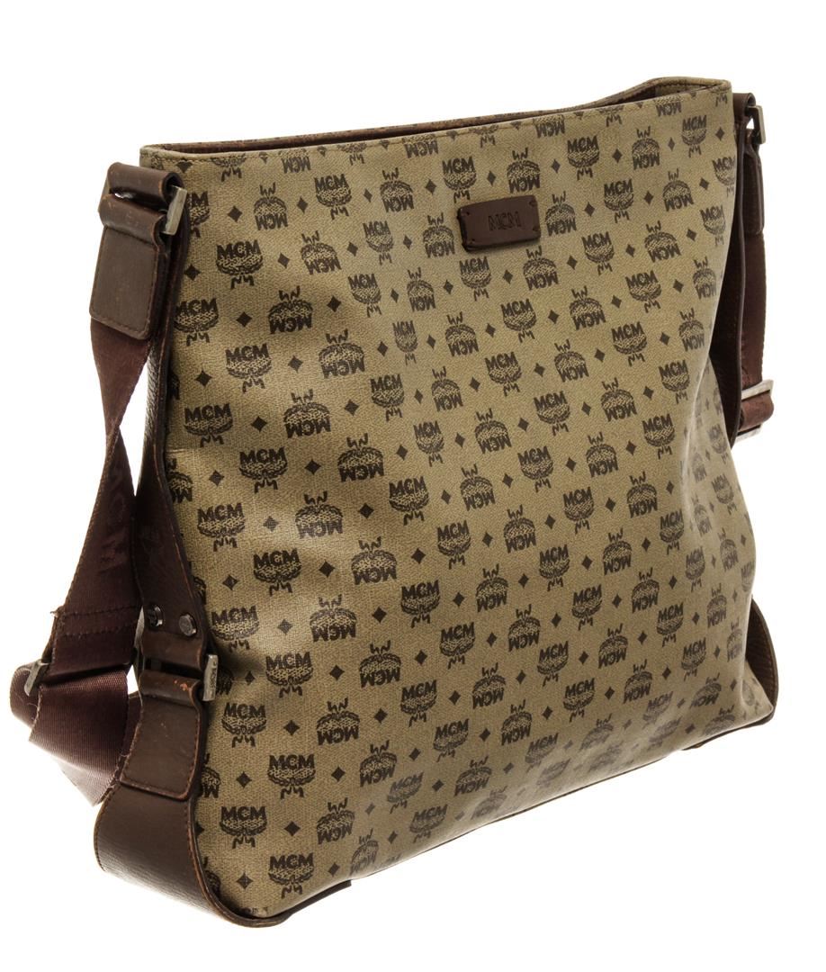 One MCM Brown Coated Canvas Crossbody Bag. Item is sold AS-IS. All available information is listed in the description and shown in the photo. MCM Brown Coated Canvas Crossbody Bag with Brown coated canvas crossbody bag with leather trim, silver-tone hardware, interior slip pockets; one with zip closure, adjustable shoulder strap, and top zipper closure. 10.5"L x 2.25"W x 10"H / 26.67 x 5.715 x 25.4 Cm