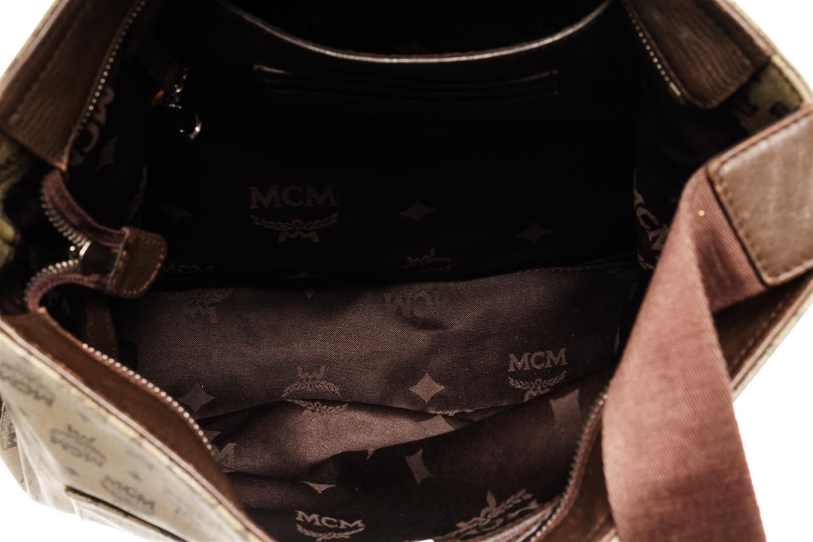One MCM Brown Coated Canvas Crossbody Bag. Item is sold AS-IS. All available information is listed in the description and shown in the photo. MCM Brown Coated Canvas Crossbody Bag with Brown coated canvas crossbody bag with leather trim, silver-tone hardware, interior slip pockets; one with zip closure, adjustable shoulder strap, and top zipper closure. 10.5"L x 2.25"W x 10"H / 26.67 x 5.715 x 25.4 Cm
