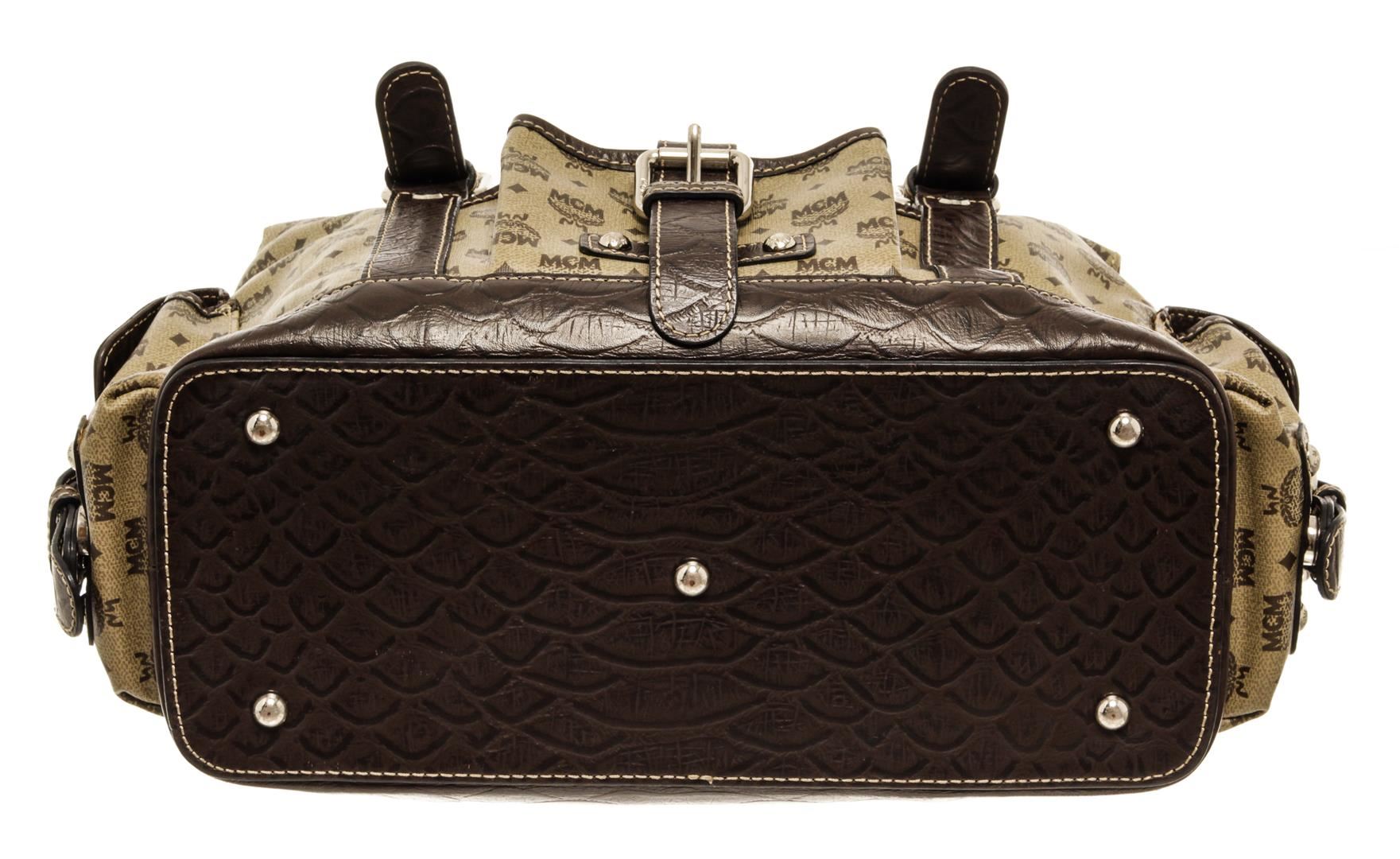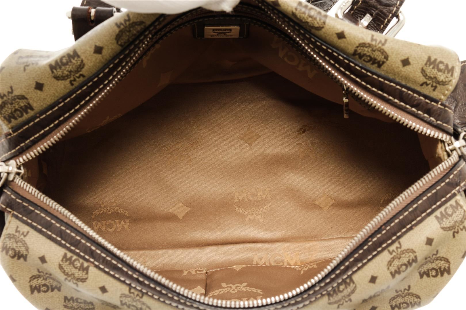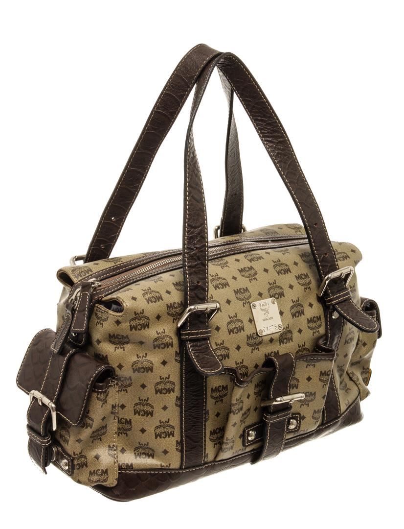 One MCM Brown Monogram Boston Bag. Item is sold AS-IS. All available information is listed in the description and shown in the photo. MCM Brown Monogram Boston Bag with exterior: minor wear, interior: dirt or marks, hardware: minor scratches, zip inner pocket, slip inner pockets, adjustable & detachable handles, bottom studs, lining material: satin, double zip closure 12.25"L x 5"W x 9"H / 31.115 x 12.7 x 22.86 Cm, Handle Drop: 9"