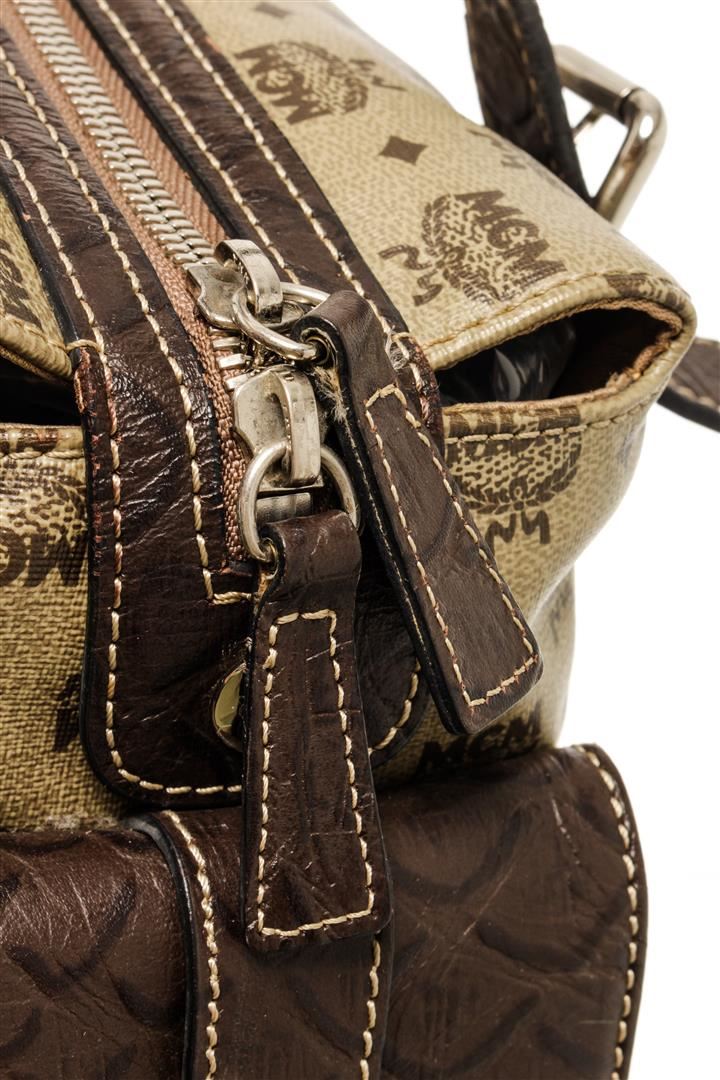 One MCM Brown Monogram Boston Bag. Item is sold AS-IS. All available information is listed in the description and shown in the photo. MCM Brown Monogram Boston Bag with exterior: minor wear, interior: dirt or marks, hardware: minor scratches, zip inner pocket, slip inner pockets, adjustable & detachable handles, bottom studs, lining material: satin, double zip closure 12.25"L x 5"W x 9"H / 31.115 x 12.7 x 22.86 Cm, Handle Drop: 9"