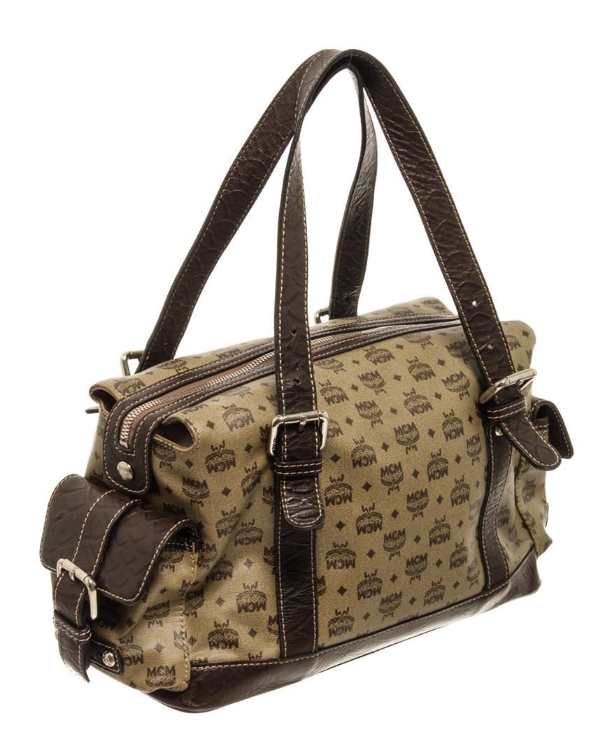 One MCM Brown Monogram Boston Bag. Item is sold AS-IS. All available information is listed in the description and shown in the photo. MCM Brown Monogram Boston Bag with exterior: minor wear, interior: dirt or marks, hardware: minor scratches, zip inner pocket, slip inner pockets, adjustable & detachable handles, bottom studs, lining material: satin, double zip closure 12.25"L x 5"W x 9"H / 31.115 x 12.7 x 22.86 Cm, Handle Drop: 9"