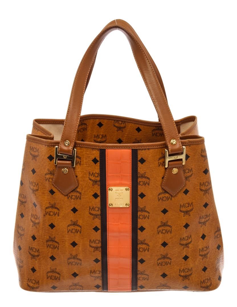 MCM Brown Visetos Leather-Trimmed Tote Bag. All available information is listed in the description and shown in the photos. MCM Brown Canvas Visetos Two Way Boston Bag with rolled leather top handles with polished gold hardware and an optional shoulder strap, The top zipper opens to a brown fabric interior with zipper and patch pockets. 86798 length: 12.00 in, Height: 8.50 in, Width: 6.50 in /30.48 x 21.59 x 16.51 CM