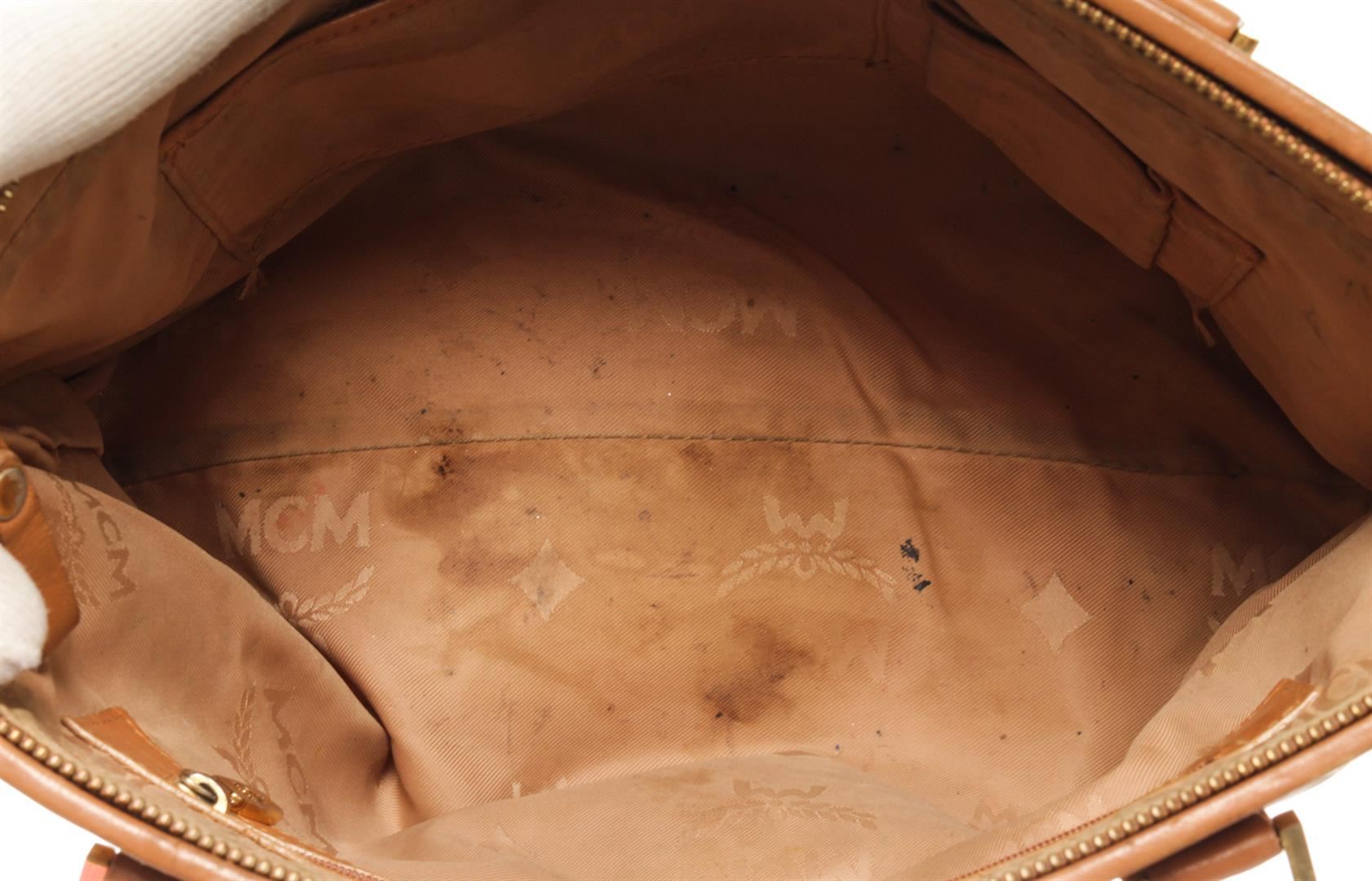 One MCM Camel Leather Shoulder Bag. Item is sold AS-IS. All available information is listed in the description and shown in the photo. MCM Camel Leather Shoulder Bag with shoulder strap, two interior slip pockets/one interior zipper pocket, fabric lining, gold-tone hardware, zipper closure. There are some marks on the bottom of the bag, stains on the interior lining. Please refer to photos. W 38 cm x H 30 cm x L 16 cm / 14.96" x 11.81" x 6.29" Inches