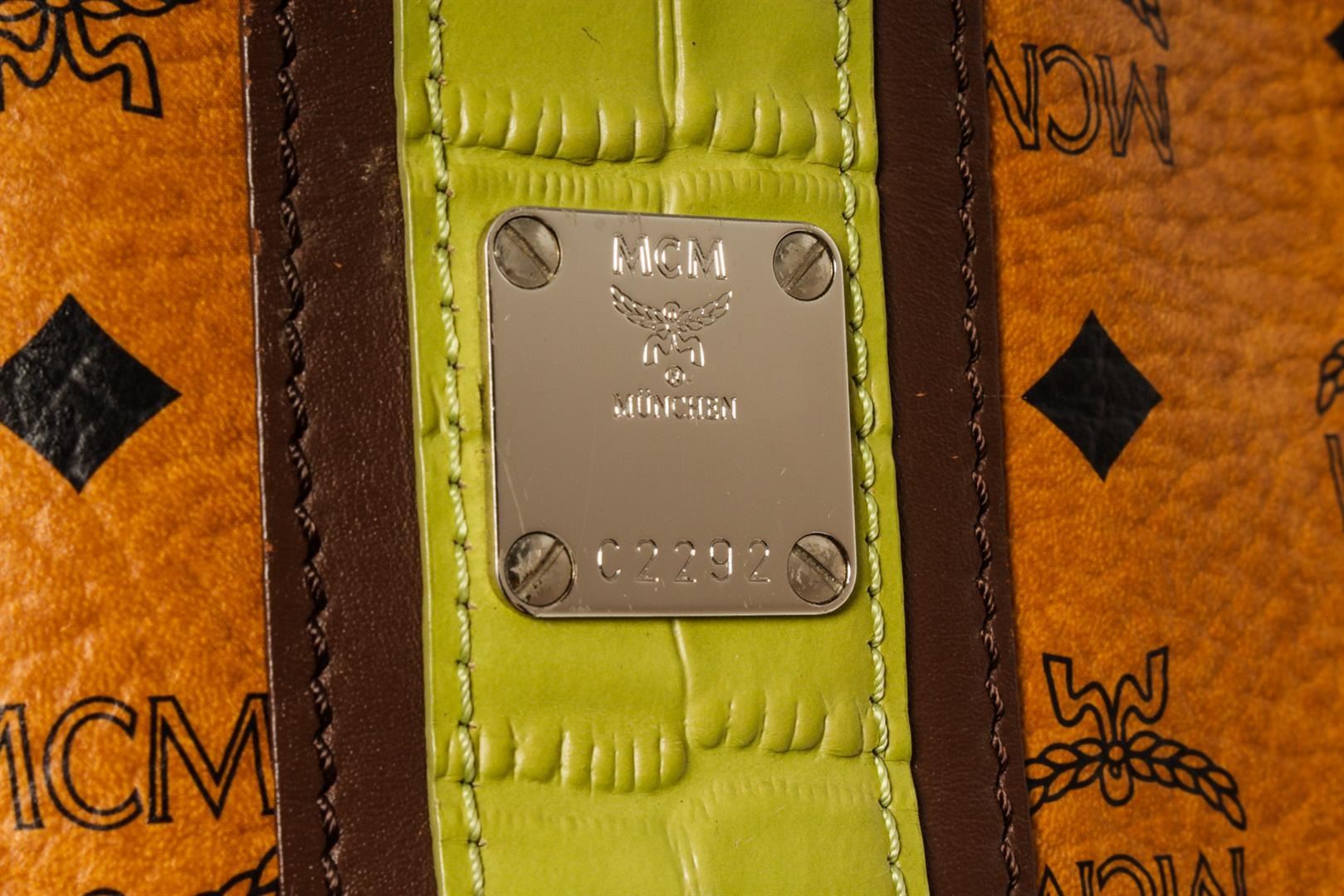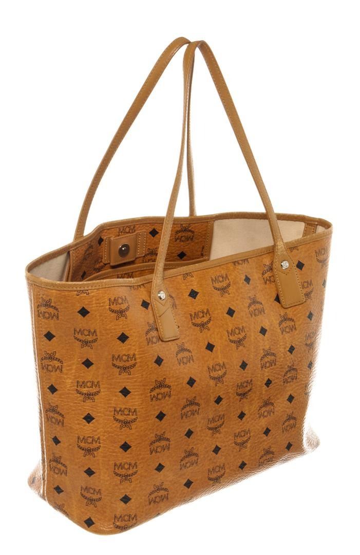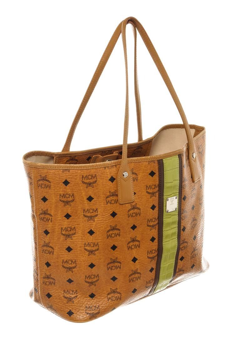 The MCM tote bag is finely crafted of brown Visetos coated canvas and the classic black MCM monogram print. It has a green stripe running through at the front, dual flat leather handles, silver-tone hardware, open top and fabric-lined interior. 17.75"