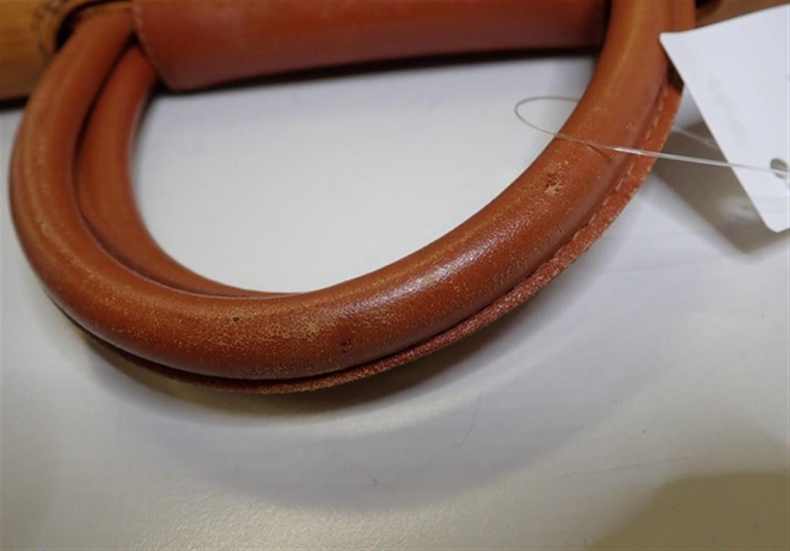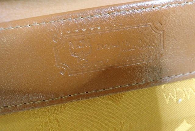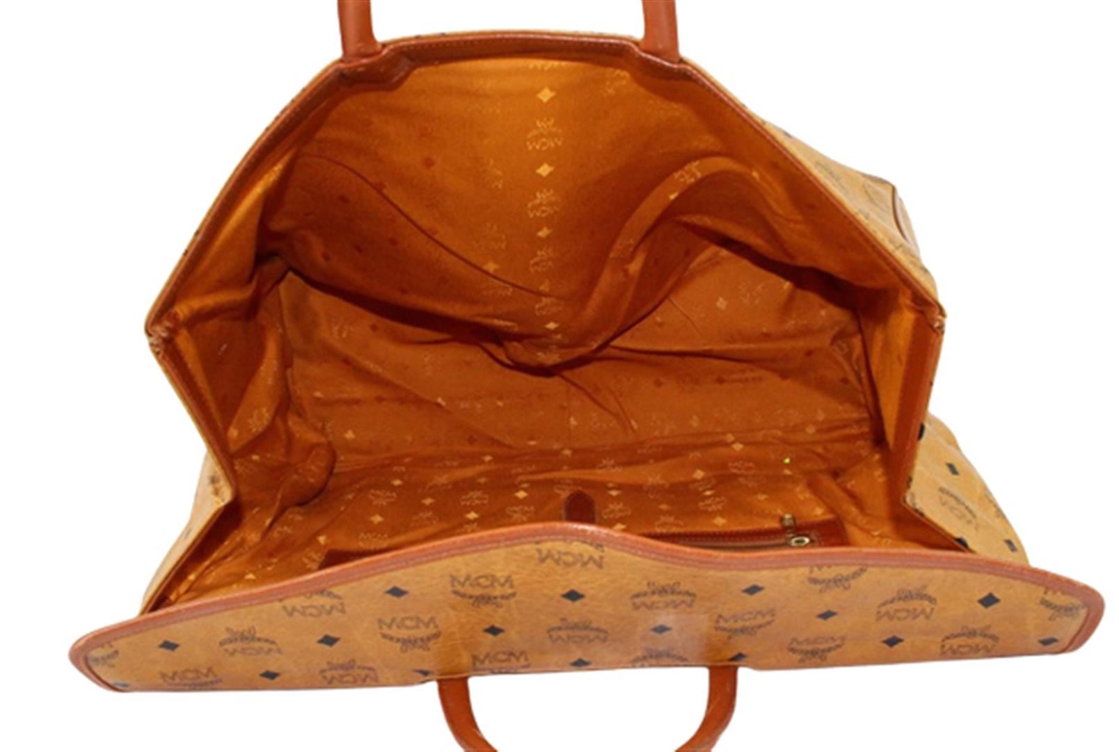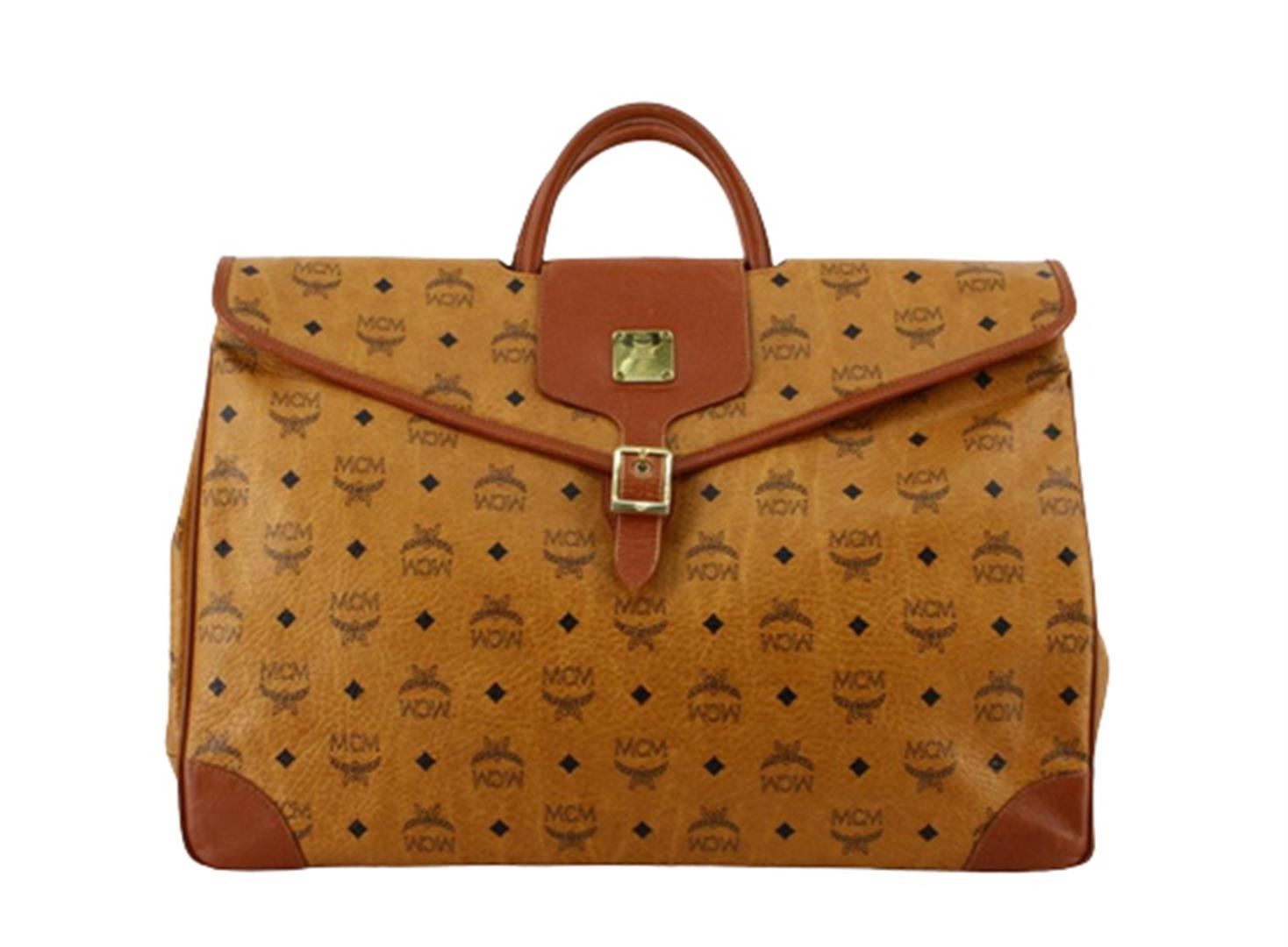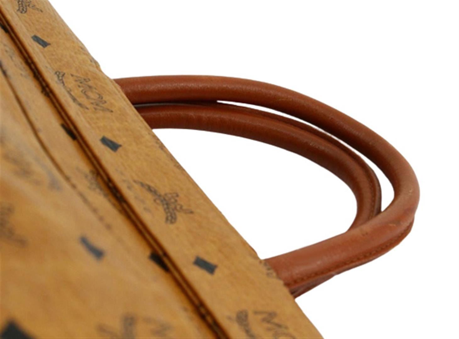 MCM satchel bag features cognac monogram Visetos coated canvas, dual rolled top handles, flap closure at top with buckle closure, brown leather trim, gold-tone hardware, cognac logo jacquard lining and one zip pocket inside. 8.4" x 10" x 3", Handle Dro
