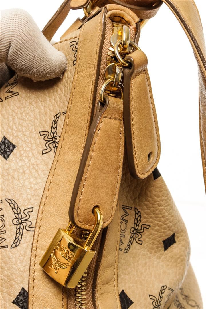 One MCM Cream Coated Canvas Visetos Hobo bag. Item is sold AS-IS. All available information is listed in the description and shown in the photo. mcm cream coated canvas visetos hobo shoulder bag with gold-tone hardware, single flat leather shoulder strap, protective feet at base, brown logo canvas lining, three interior pockets, one with zip closure and overall zip closure at top. 17.95"L x 6.45"W x 11.95"H / 45.59 X 16.38 X 30.35 cm