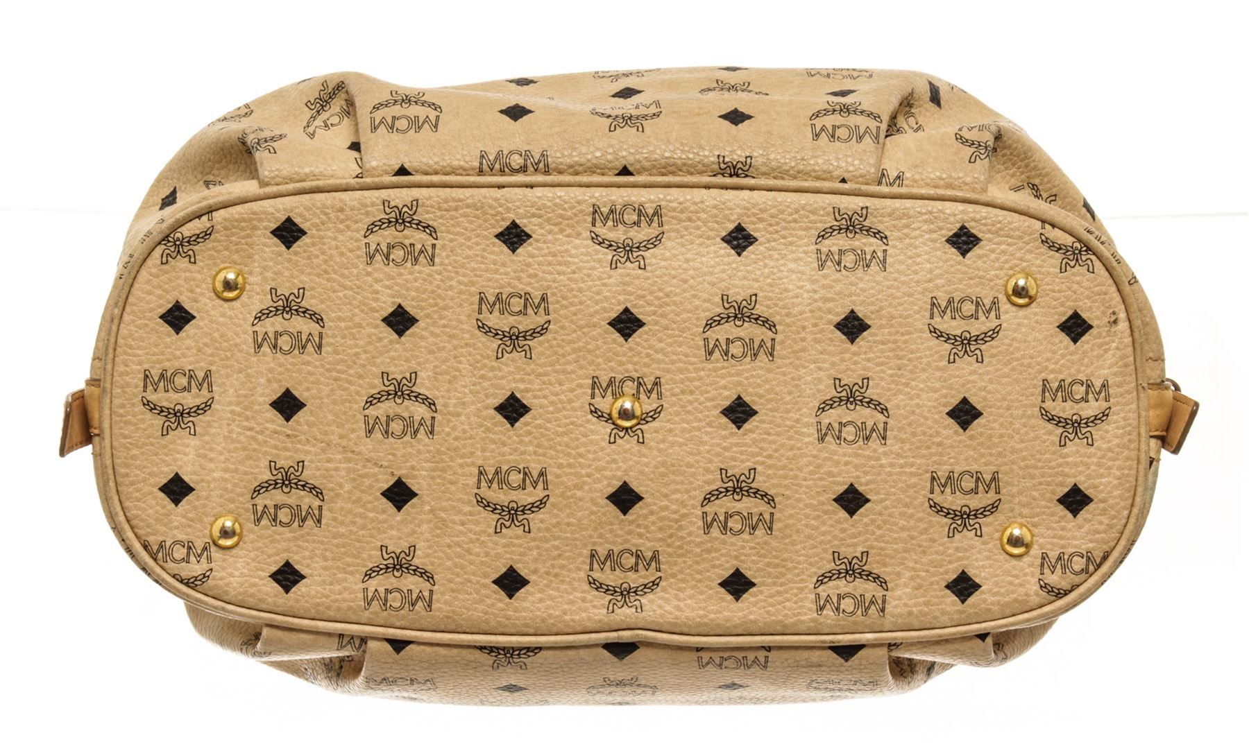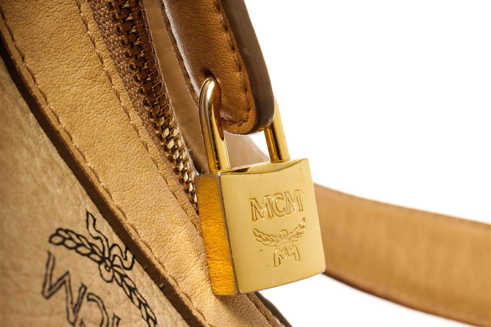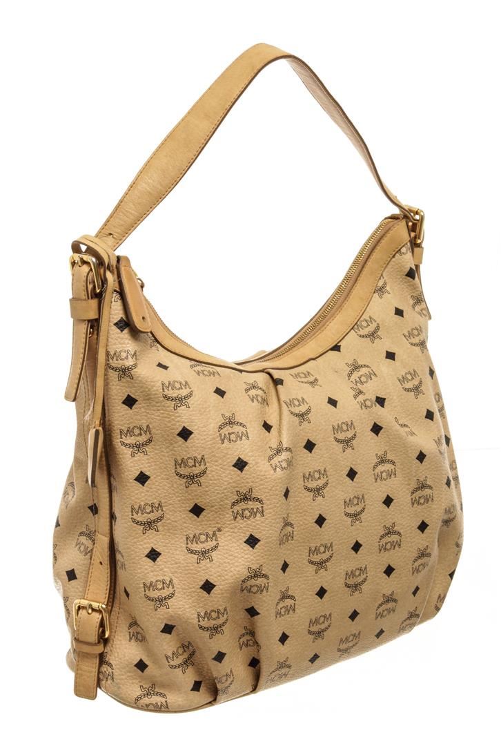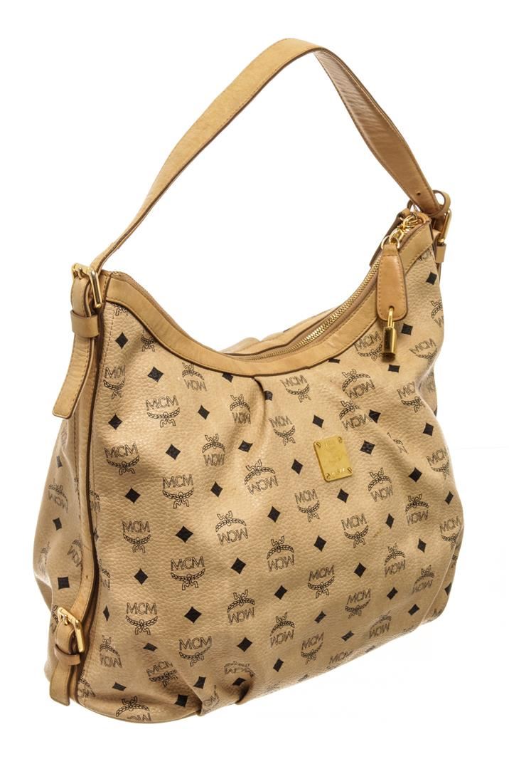 One MCM Cream Coated Canvas Visetos Hobo bag. Item is sold AS-IS. All available information is listed in the description and shown in the photo. mcm cream coated canvas visetos hobo shoulder bag with gold-tone hardware, single flat leather shoulder strap, protective feet at base, brown logo canvas lining, three interior pockets, one with zip closure and overall zip closure at top. 17.95"L x 6.45"W x 11.95"H / 45.59 X 16.38 X 30.35 cm