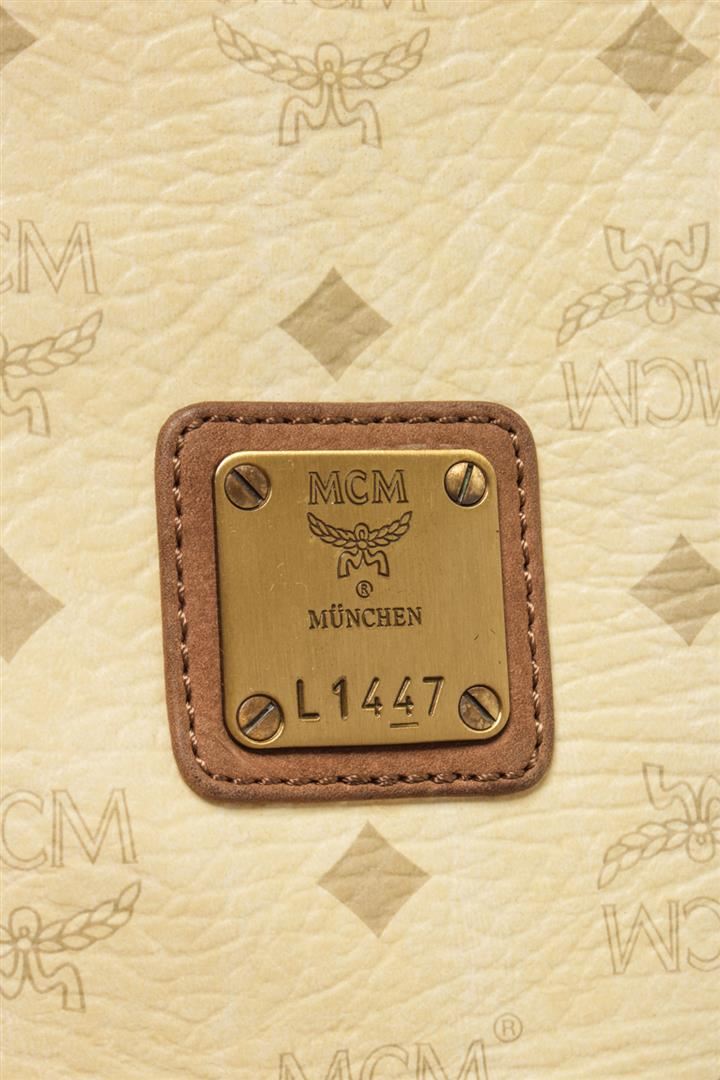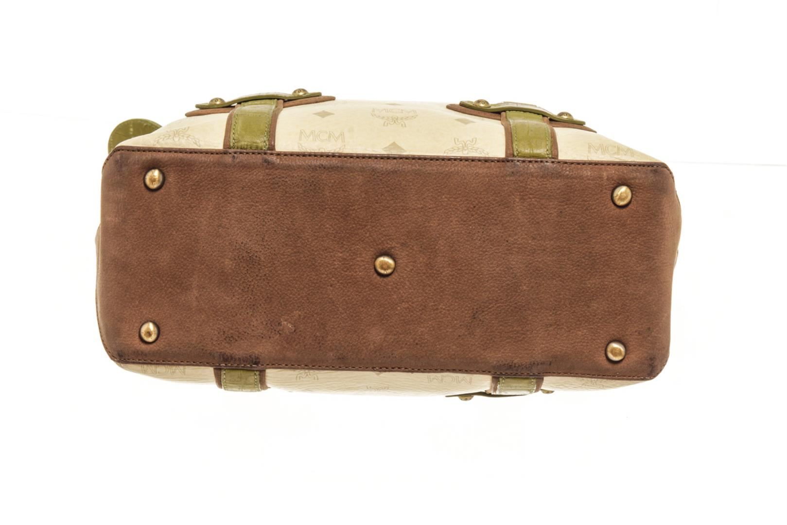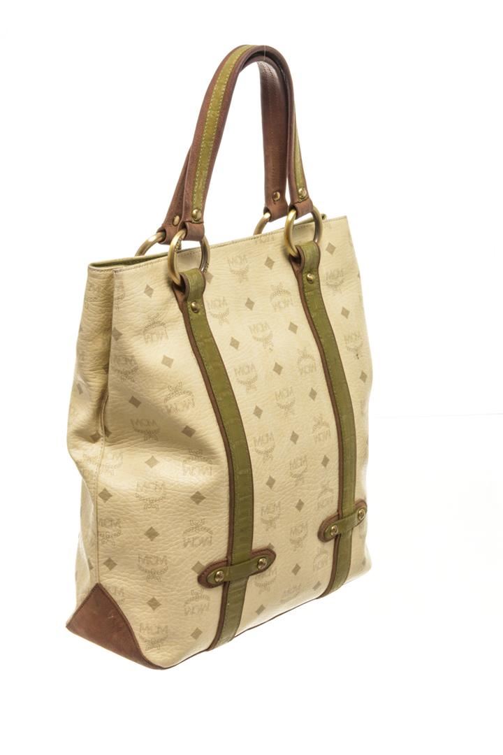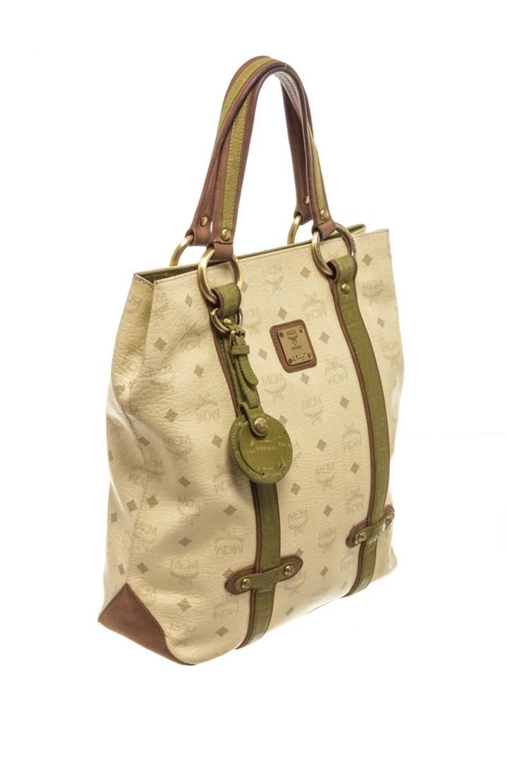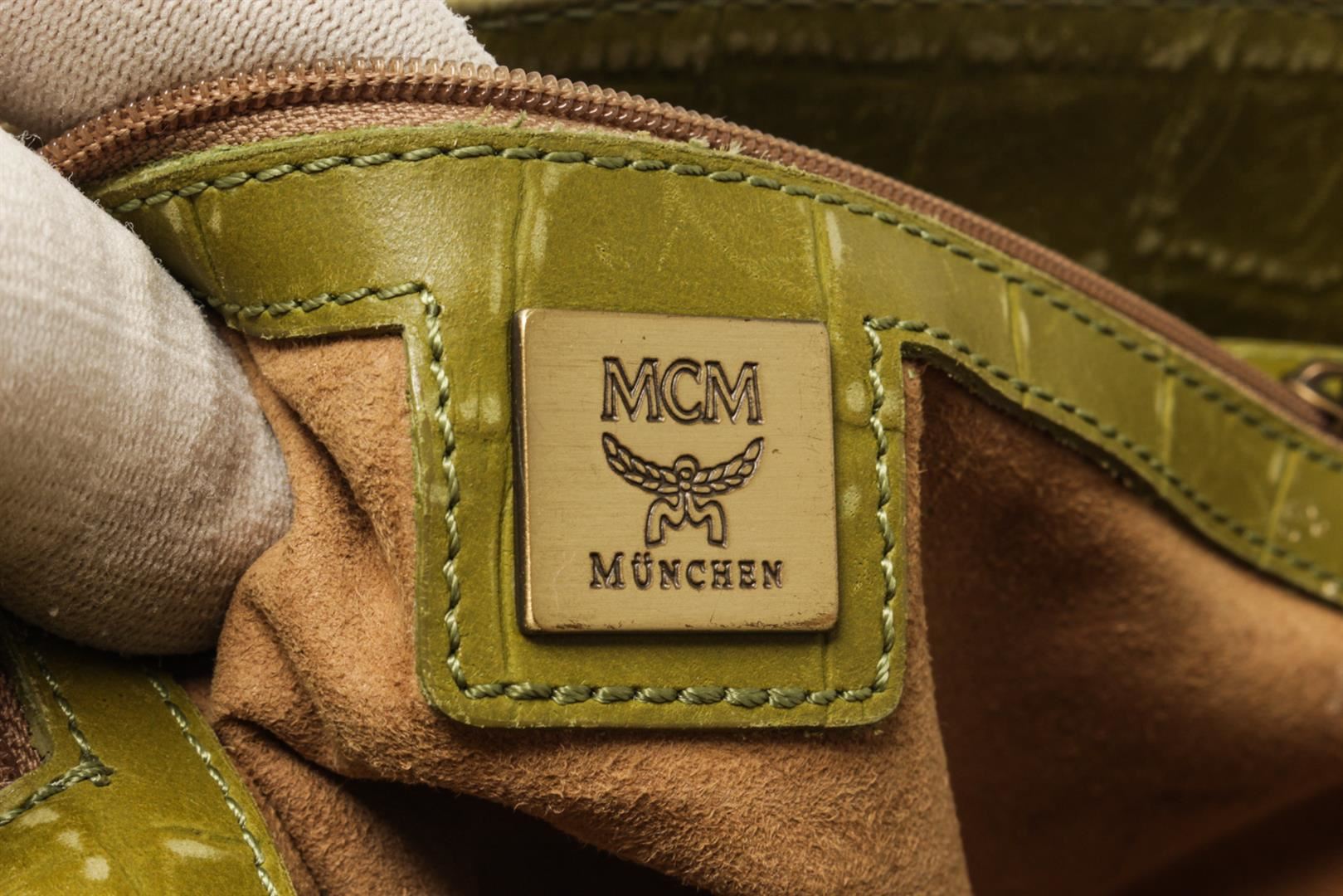 One MCM Green Leather Shoulder Bag. Item is sold AS-IS. All available information is listed in the description and shown in the photo. MCM Green Leather Shoulder Bag with top handle, suede lining, interior slip pockets, green leather, gold tone hardware and snap closure. There are marks on the suede lining. Please refer to photos.