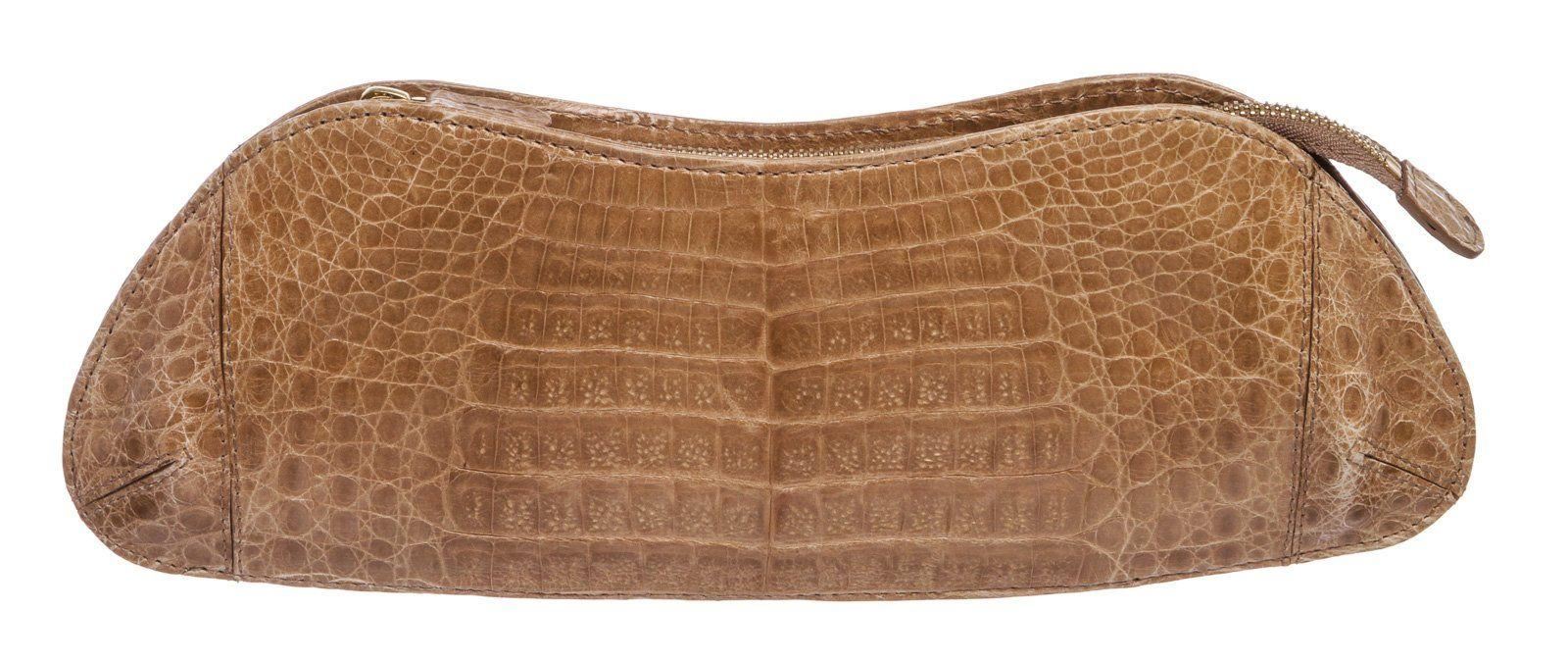 MCM Light Brown Crocodile Leather Evening Clutch. All available information is listed in the description and shown in the photos. Light brown crocodile leather MCM Evening clutch with gold-tone hardware, leather interior lining, zipper pocket at interior wall and an overall zipper closure. 13"x1.75"x5"