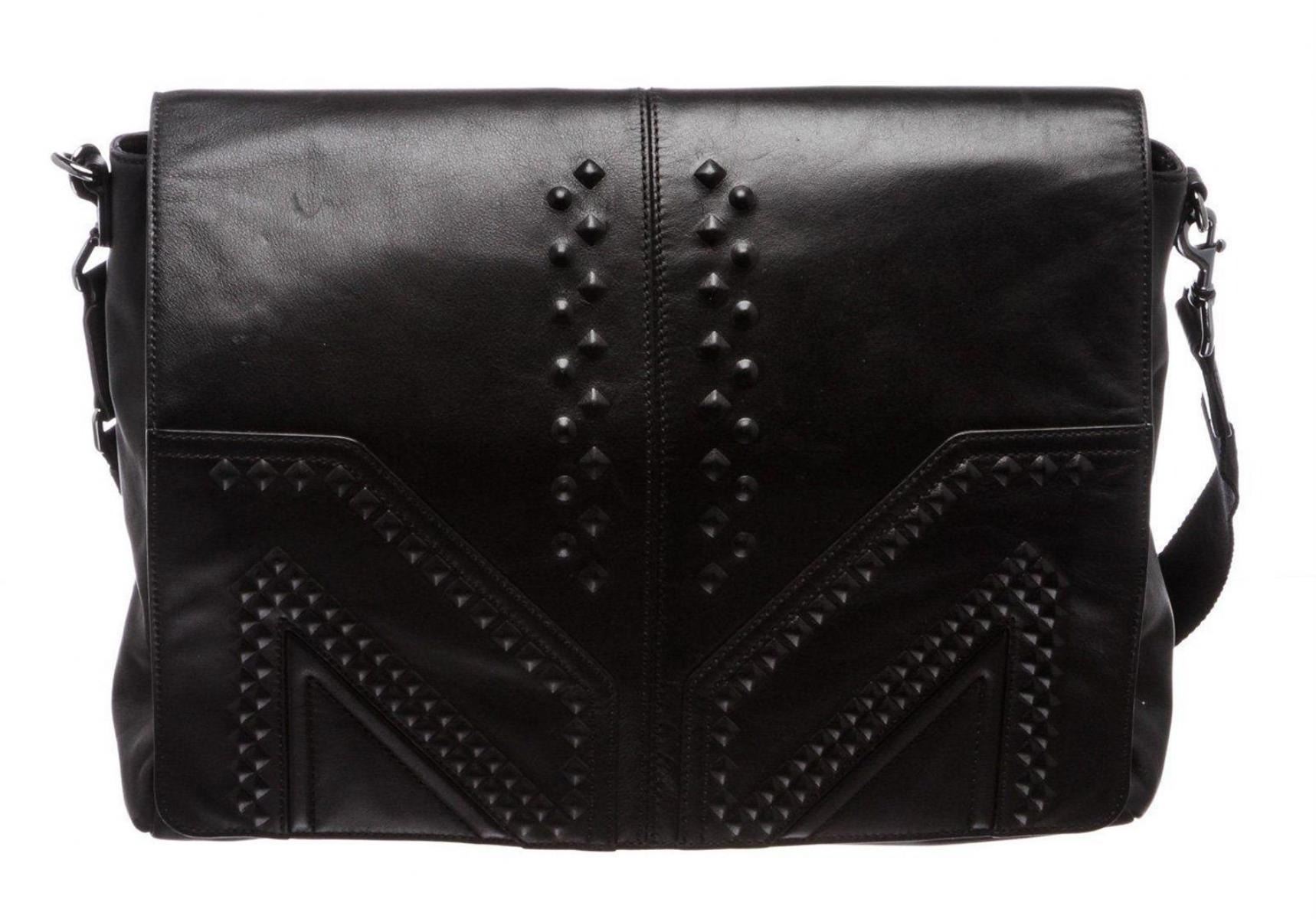 Black leather MCM M. Moment messenger bag contains tonal stitching, debossed stud details at front face and detachable shoulder strap. Interior is satin lined and contains two compartments, one zipper two zipper pockets, and two side slip pockets. Exterior contains a zip pocket under the dual magnetic flap closure at front. Measurements: Length: 16 in / 41 cm Width: 3.25 in / 8 cm 12 in / 30 cmCONDITION: Pre-Owned Good overall, please see photographs for detail.