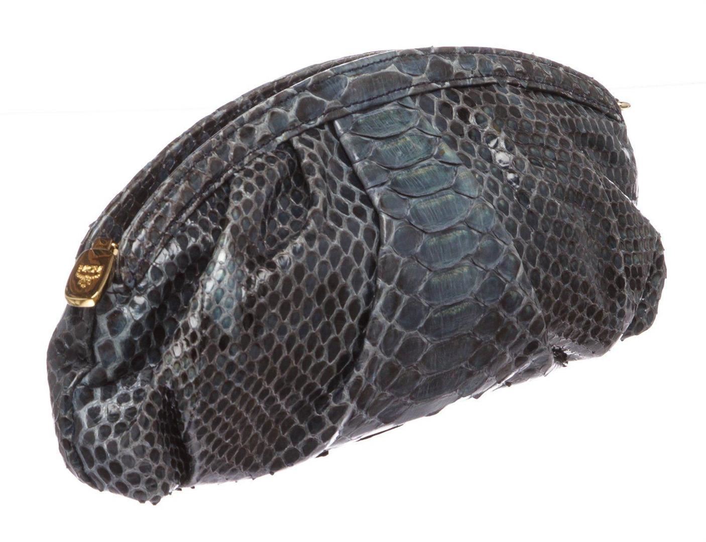 Overall zipper closure. Interior is satin lined with one slip pocket and one zipper pocket. Measurements: Length: 10 in / 25 cm Width: 1 in / 3 cm 5.5 in / 14 cm Condition: Pre-Owned Good overall, please see photographs for detail.
