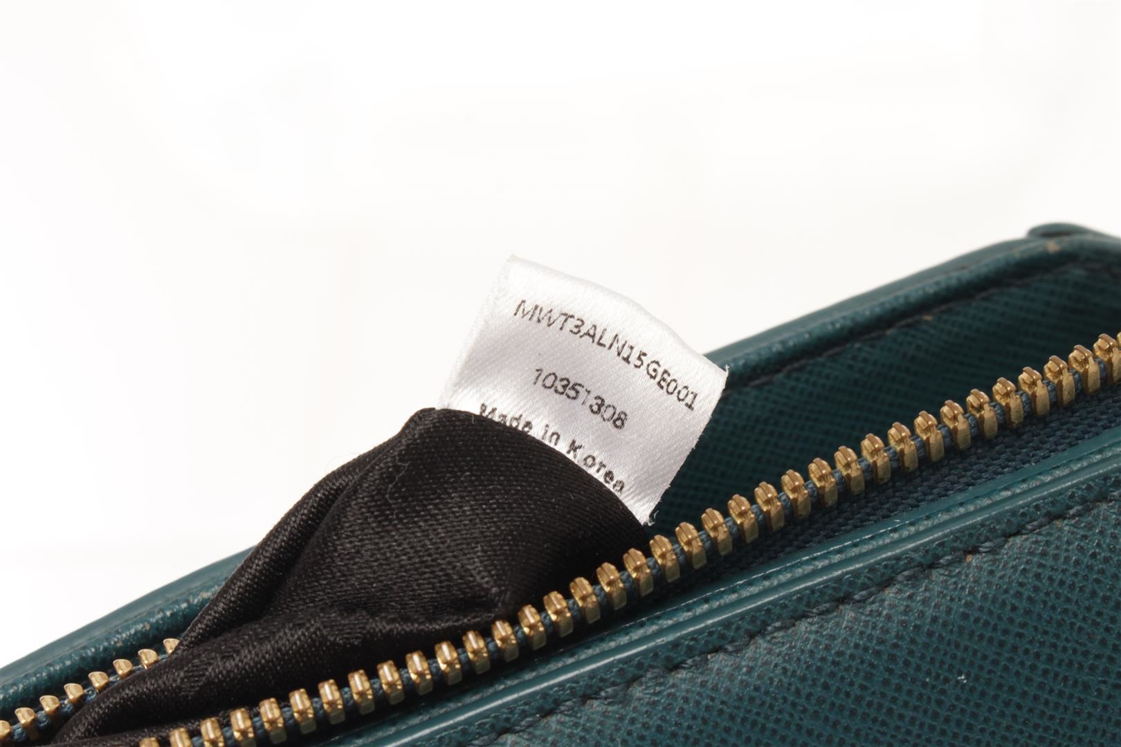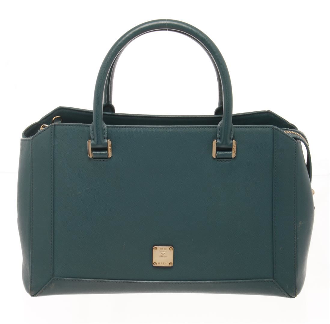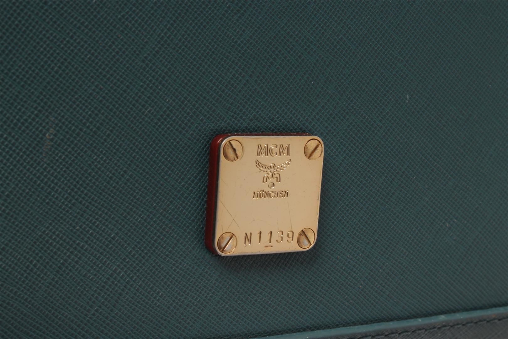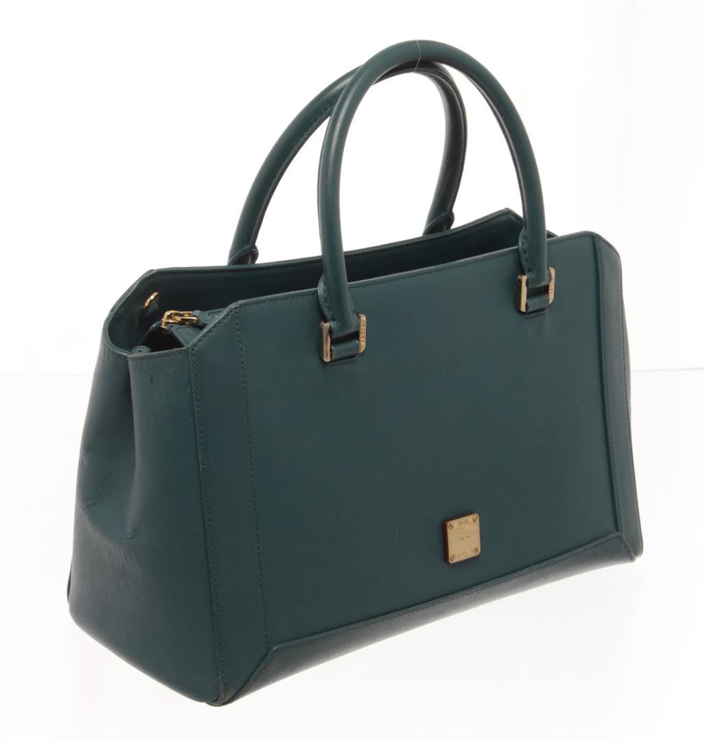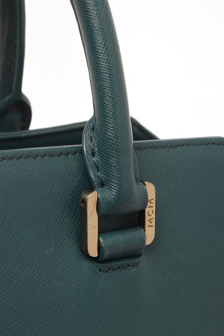 MCM Teal Leather 2 Way Shoulder Bag. All available information is listed in the description and shown in the photos. mcm teal leather 2 way shoulder bag with Gold-Tone Hardware, Rolled Handles & Single Adjustable Shoulder Strap, Leather Trim, Logo Jacquard Lining & Five Interior Pockets, Zip Closure at Top. Height: 8.5", Width: 12.25", Depth: 4.5"