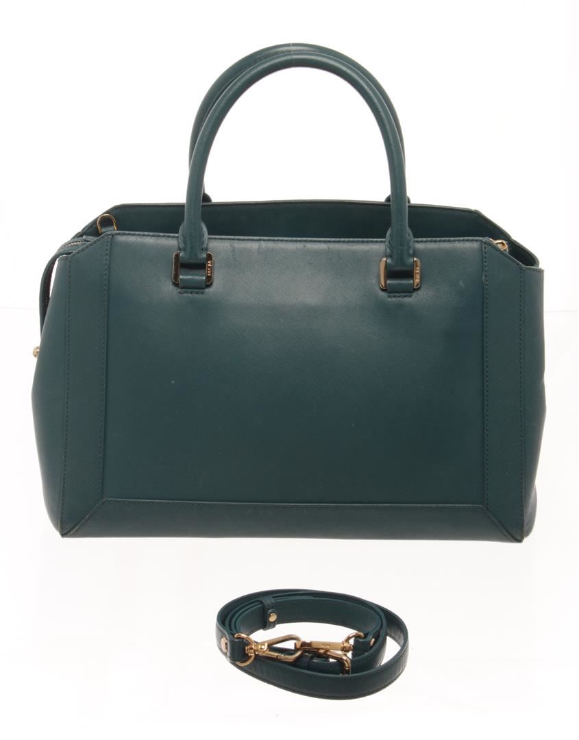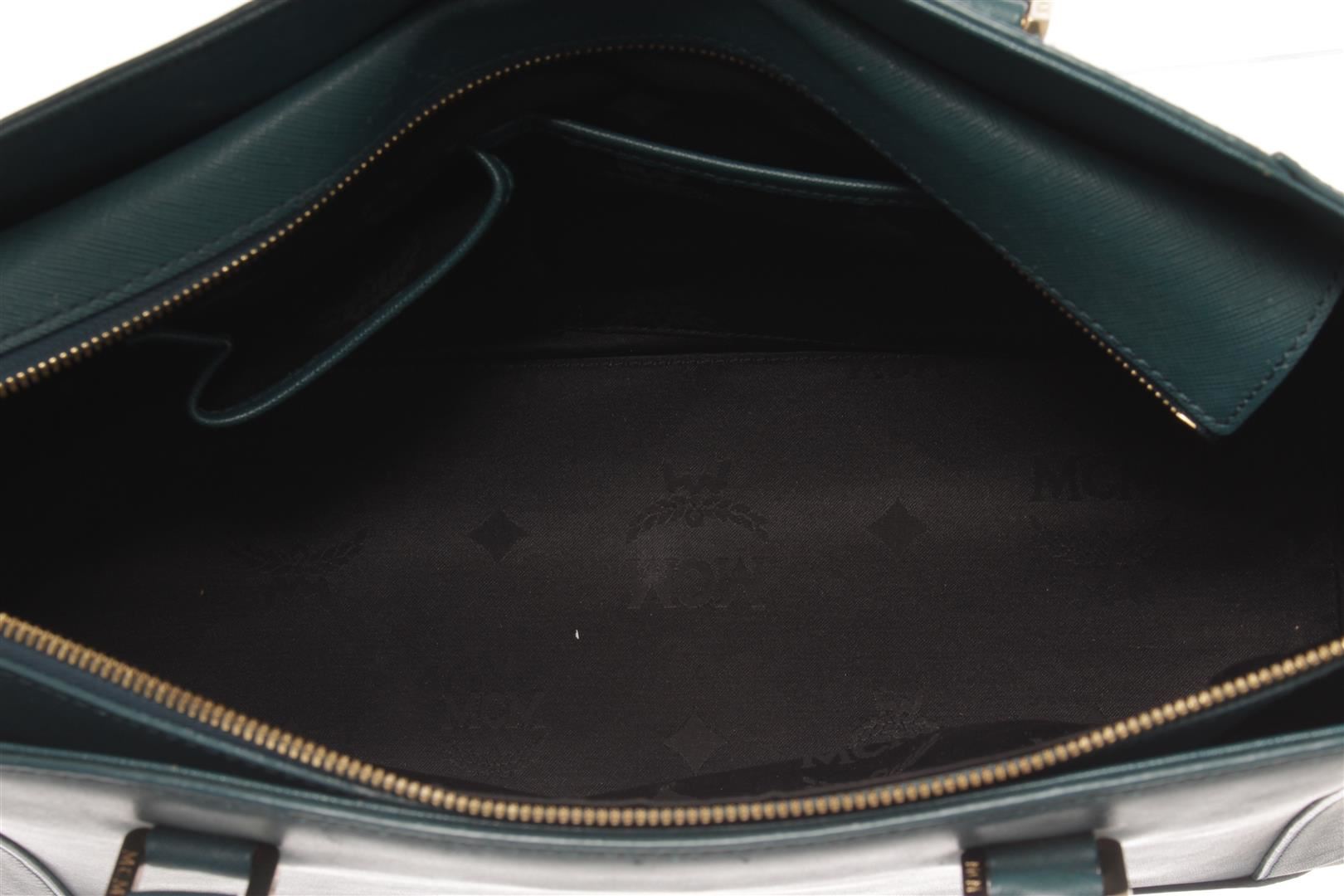 MCM Teal Leather 2 Way Shoulder Bag. All available information is listed in the description and shown in the photos. mcm teal leather 2 way shoulder bag with Gold-Tone Hardware, Rolled Handles & Single Adjustable Shoulder Strap, Leather Trim, Logo Jacquard Lining & Five Interior Pockets, Zip Closure at Top. Height: 8.5", Width: 12.25", Depth: 4.5"