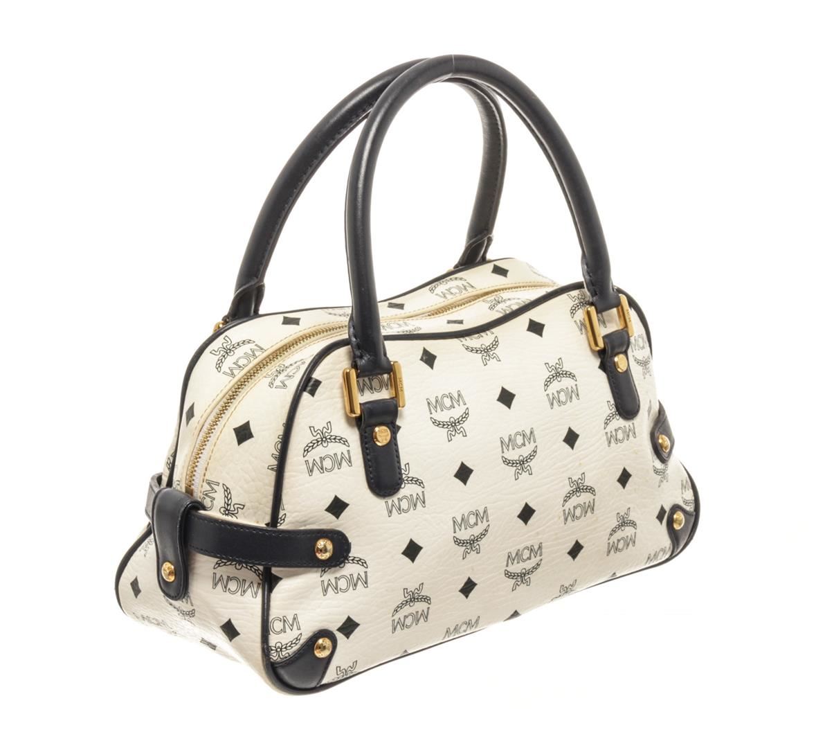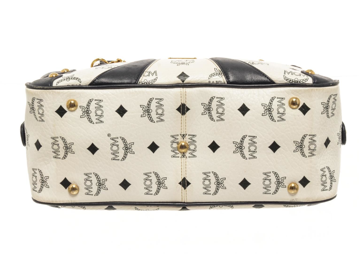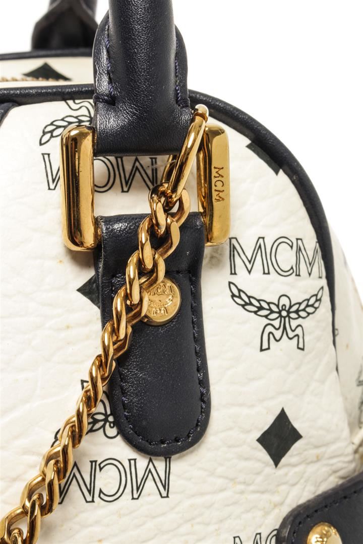 One MCM White Coated Canvas Tote Bag. Item is sold AS-IS. All available information is listed in the description and shown in the photo. MCM White Coated Canvas Tote Bag with top handle, gold hardware, gold chain, blue fabric lining, zipper closure.
