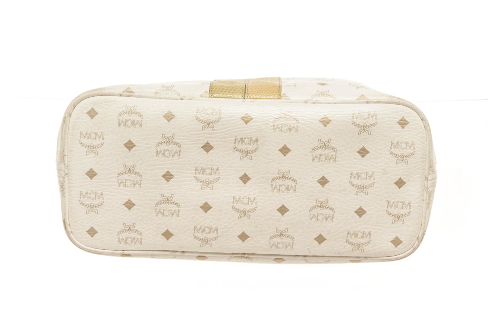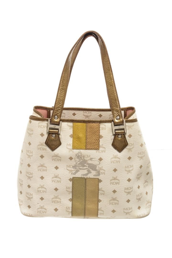 One MCM White Leather Lion Visetos Shopper Bag. Item is sold AS-IS. All available information is listed in the description and shown in the photo. mcm white leather lion visetos shopper bag with features a leather body, flat shoulder straps, an open top, interior zip and slip pockets, and an interior zip pouch. Height: 10.6" Width: 17.3" Depth: 6.1", Handle Drop: 8.7" / 26.92 x 43.94 x 15.49 Cm