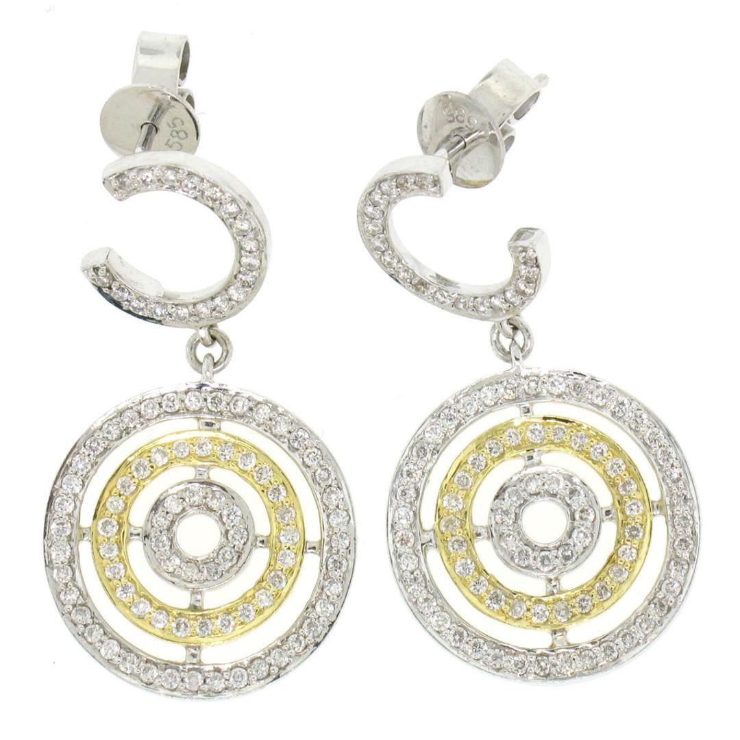 MODERN 14k Yellow White Gold 1.2ctw Multi Circle Pave Diamond Dangle Earrings. Please see photos and description for all available information. A new solid 14k yellow and white gold dangle earrings, featuring 186 round brilliant cut natural diamonds (G - VS2; 1.20ctw). The earrings measure approximately 31.60x17.10mm and weigh a total of 6.6 grams.