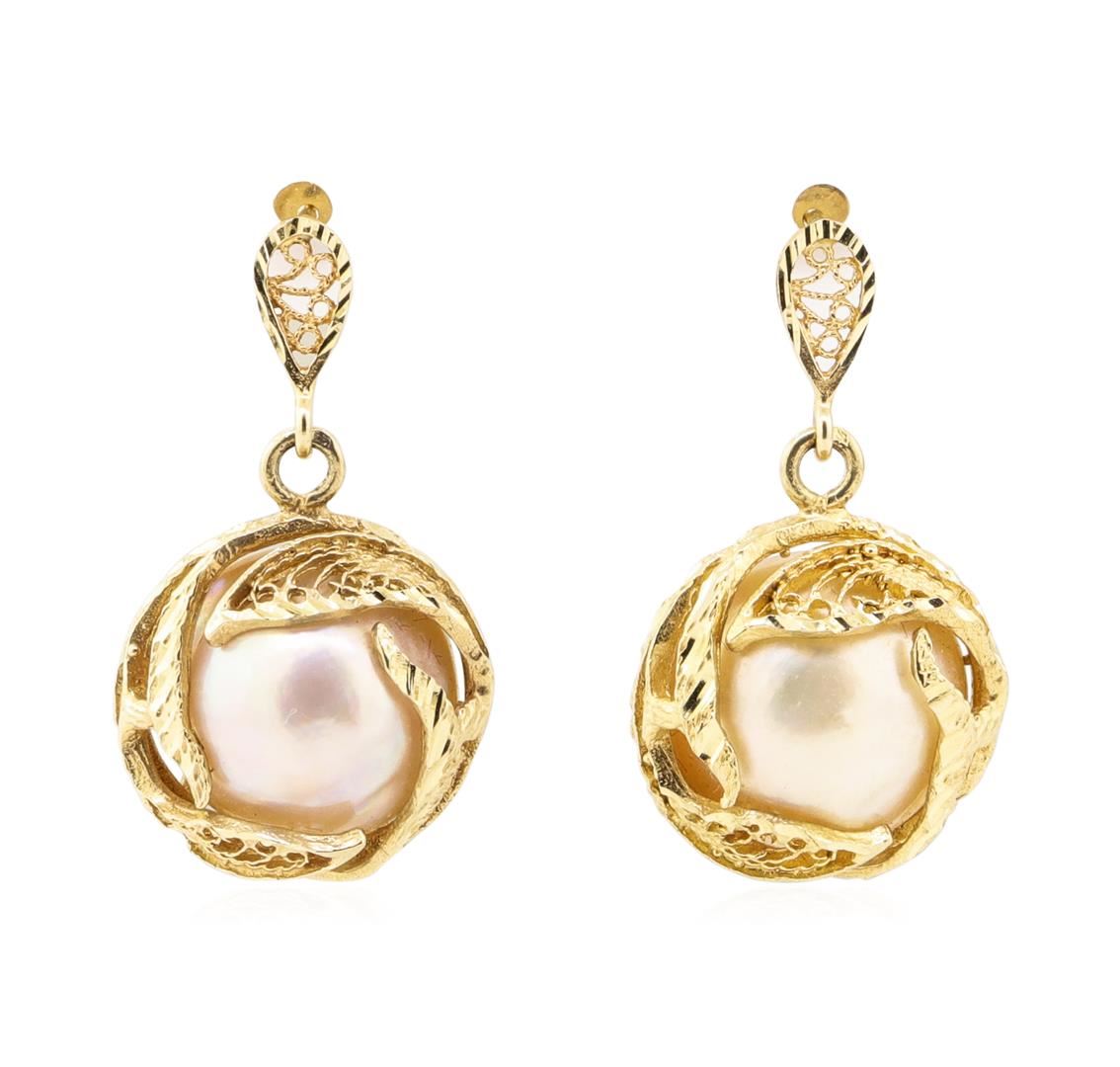 One pair of mabe pearl dangle earrings with a drop of approximately 30 millimeters featuring: 14KT yellow gold weighing 8.1 grams containing two mabe pearls measuring approximately 14 millimeters in diameter.
