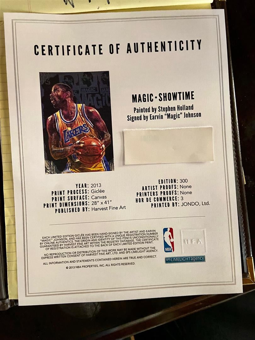 A stretched giclee on canvas, hand signed by the Magic Johnson & by artist Stephen Holland 29.5x42.5" w/ Certificate. Framed.