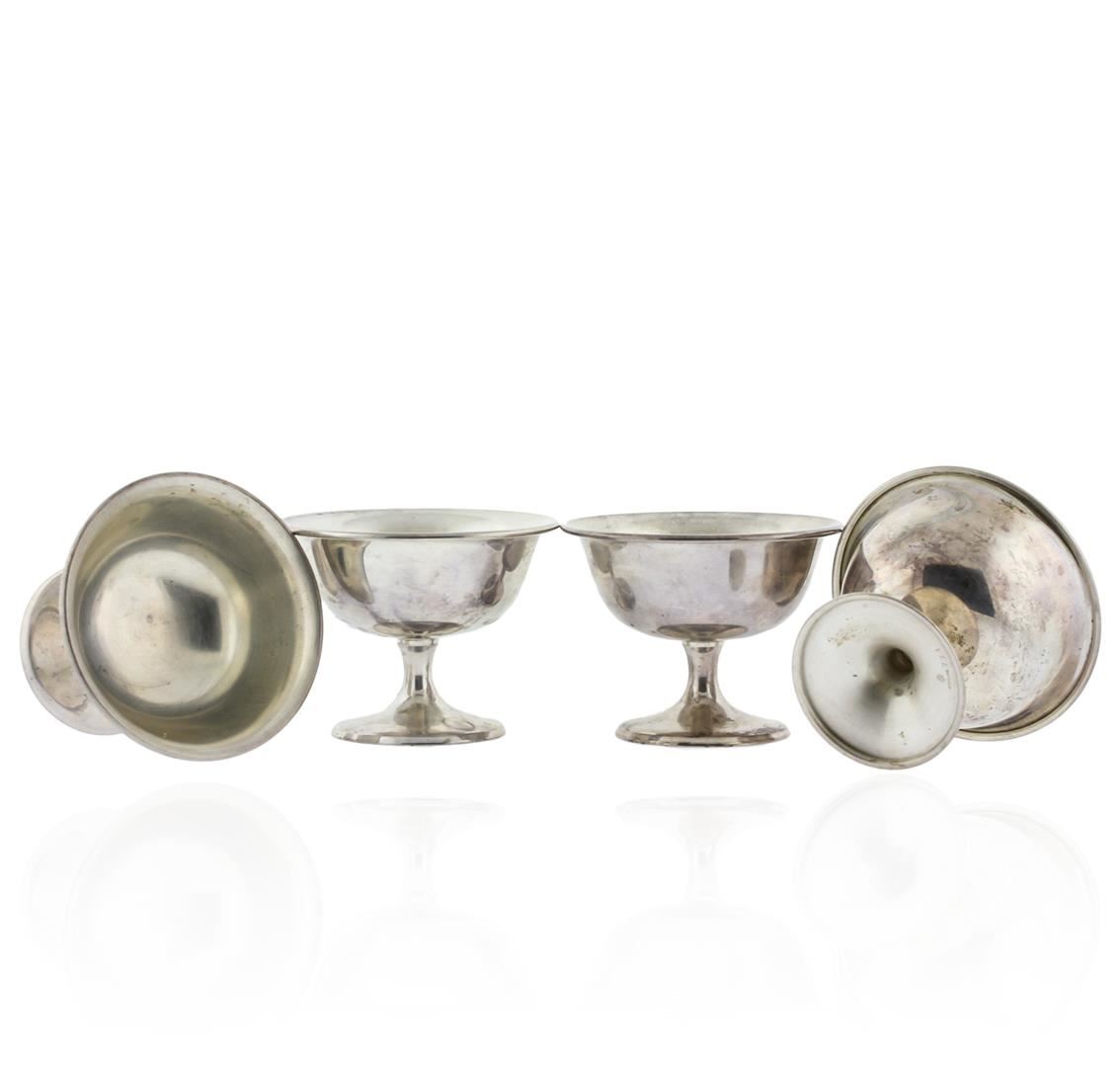 One vintage set of 4 sterling silver dessert bowls on pedestal bases. Manufacturer: Manchester Silver Co. of Providence, Rhode Island (in business 1887-1985). No monogram or monogram removal. In excellent vintage condition with just minor surface scratching. They are 2 7/8" tall. The diameter at the top is 3 3/4" and 2 3/8" at the base.