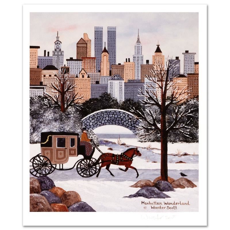 Cozy, down-home images of a bygone era when life was simpler - this is the feeling captured in the creations of one of the world's most recognized artists. "Manhattan Wonderland" is a limited edition lithograph on paper, numbered and hand signed by Wooster Scott. Includes letter of authenticity. Measures approx. 12" x 14.5" (with border), 10" x 12" (image)