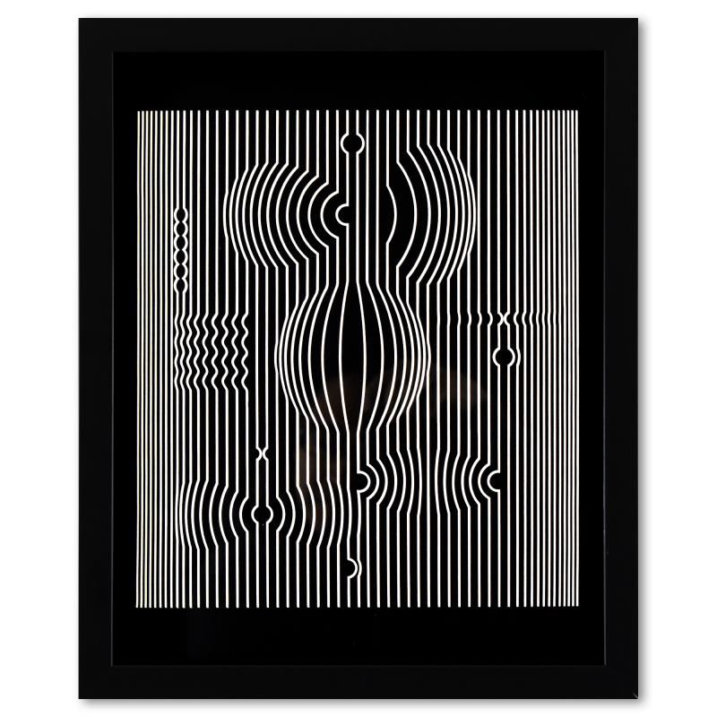 "Manipur de la série Ondulatoires" is a heliogravure print on paper, published in 1973, by Victor Vasarely (1908-1997). This piece comes custom framed, with a letter of authenticity and with a 1976 Vasarely paperback. Measures approx. 12.5" x 15" (frame), 10" x 13" (image).