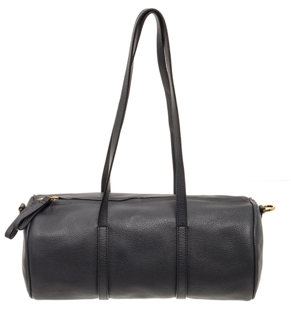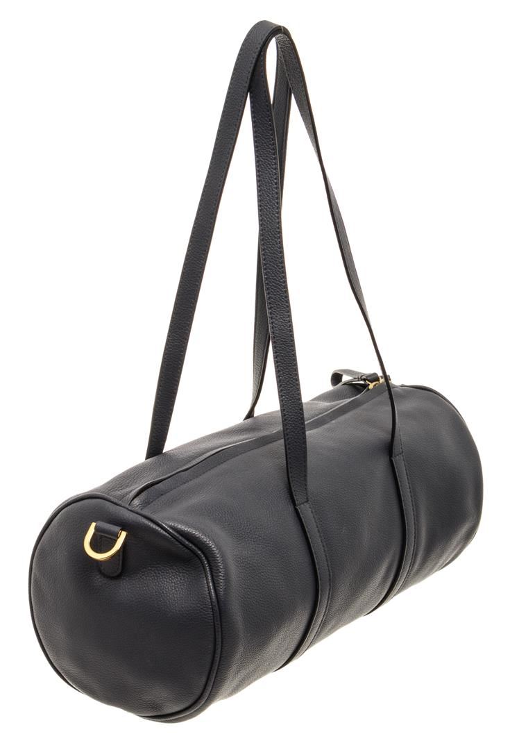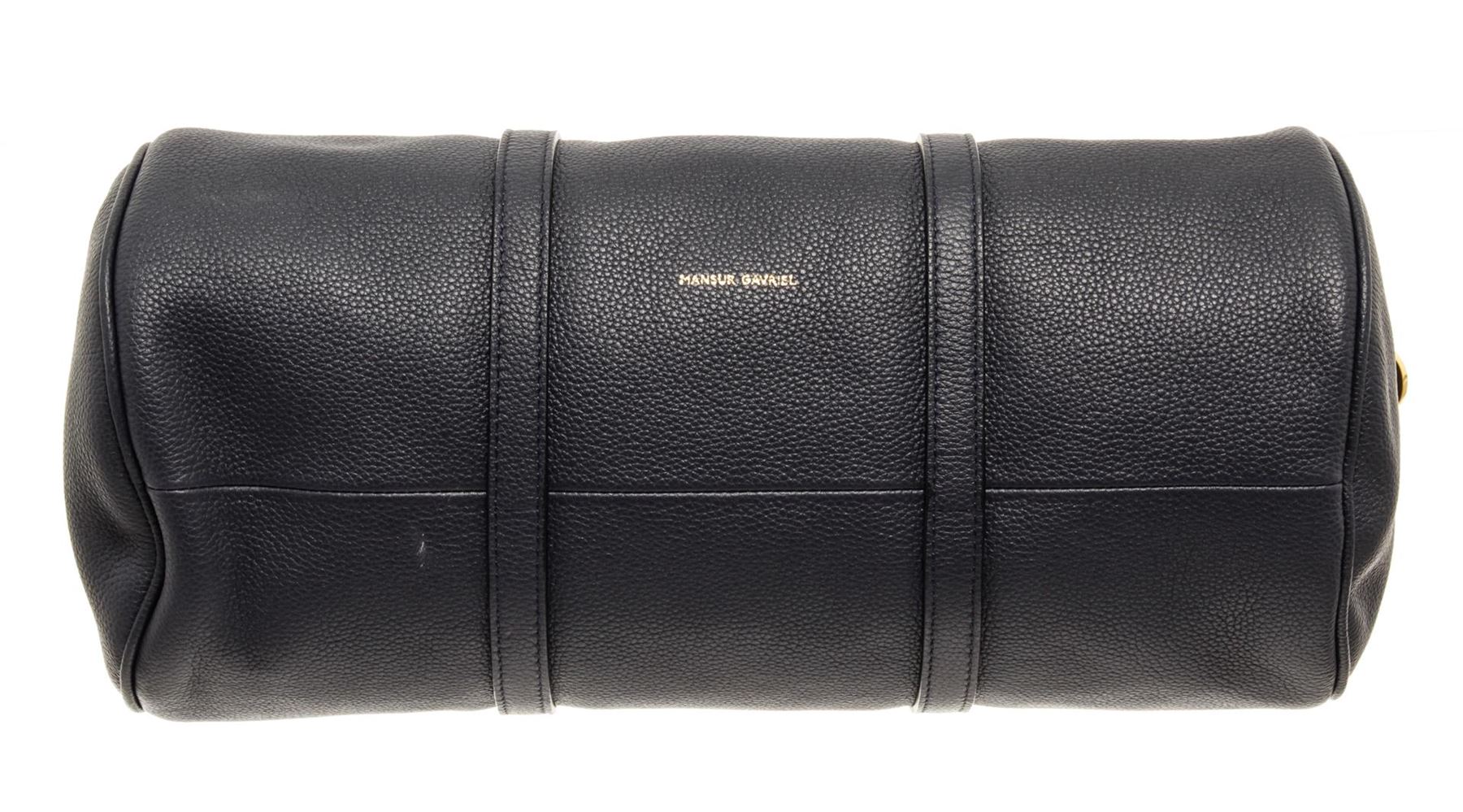 Mansur Gavriel Black Leather Duffle Mini Bag. All available information is listed in the description and shown in the photos. Mansur Gavriel Black Leather Duffle Mini Bag with gold-tone hardware, black leather trim, gold-tone metal strap rings at both sides, gold-tone logo embossed at the bottom front, black leather lining, single leather adjustable & detachable long shoulder strap, dual leather flap top handles, and zip closure at the top. .