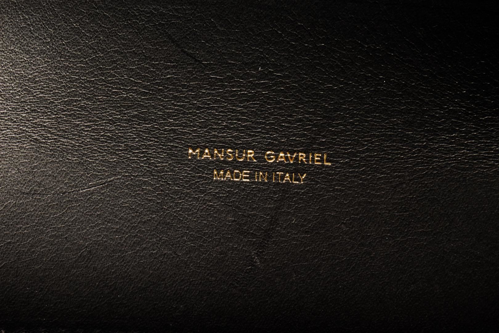 Mansur Gavriel Black Leather Travel Bag. All available information is listed in the description and shown in the photos. Mansur Gavirel Black Leather Travel Bag with Gold-tone hardware, Red Leather Lining, Adjustable Long Shoulder Strap, Interior Zip Pocket, Dual Top Handles, and Zipper Closure at the top.