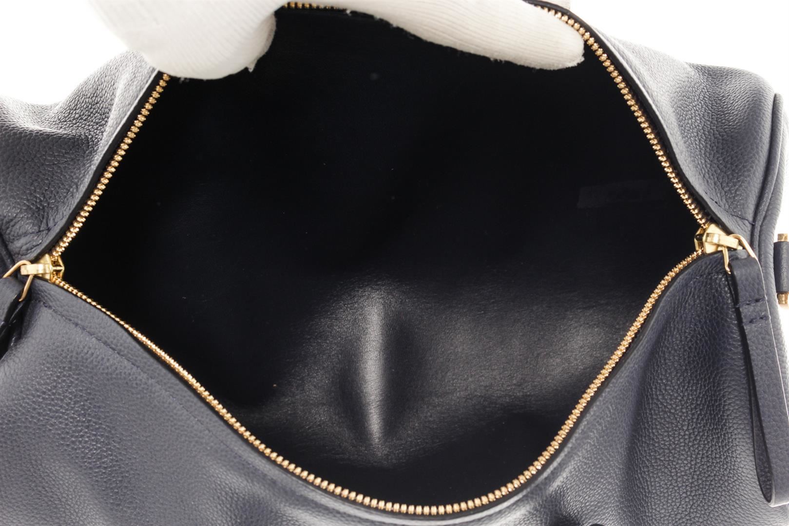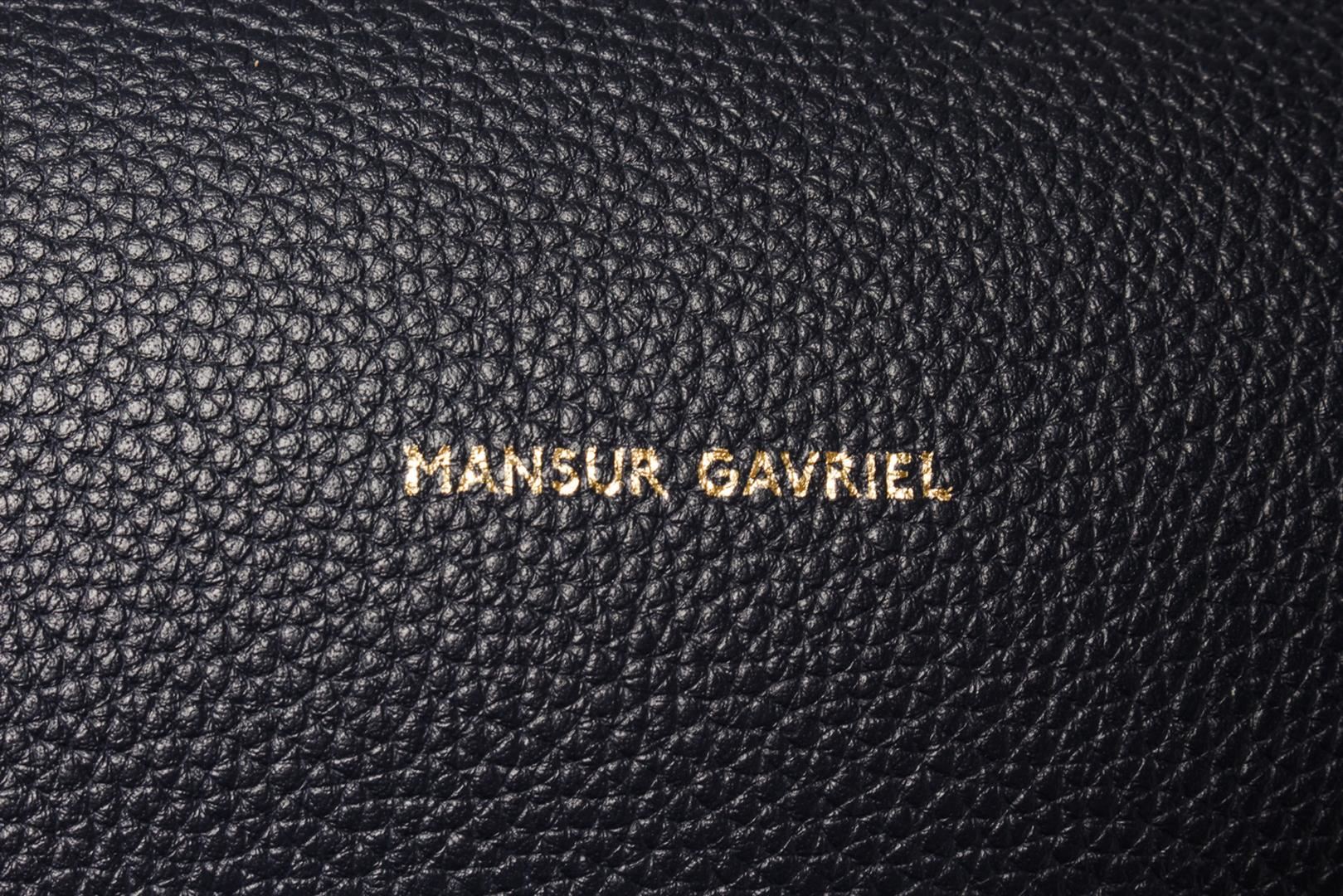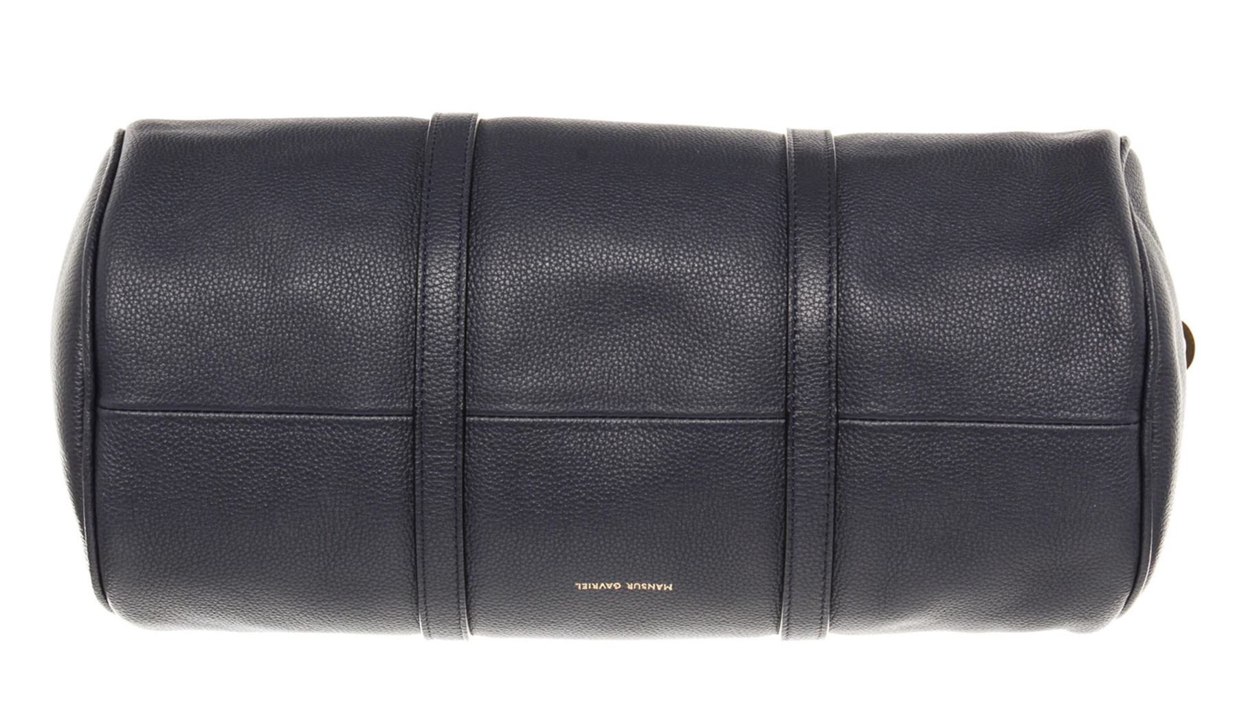 Mansur Gavriel Mini Duffle crossbody bag is crafted in navy blue Lambskin leather, gold-tone hardware, a long adjustable long leather strap that can be detachable, two top flat handles, two-way zip closure at top and black leather 8.5" L x 4" W x 4" H,
