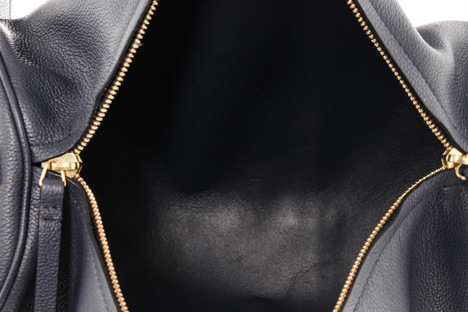 One Mansur Gavriel Navy Blue Lambskin Leather Mini Duffle Shoulder Bag. Item is sold AS-IS. All available information is listed in the description and shown in the photo. Mansur Gavriel Mini Duffle shoulder bag is crafted in navy blue Lambskin leather, gold-tone hardware, two top flat handles, two-way zip closure at top and black leather lining. 8.5" L x 4" W x 4" H, Handle Drop: 5"