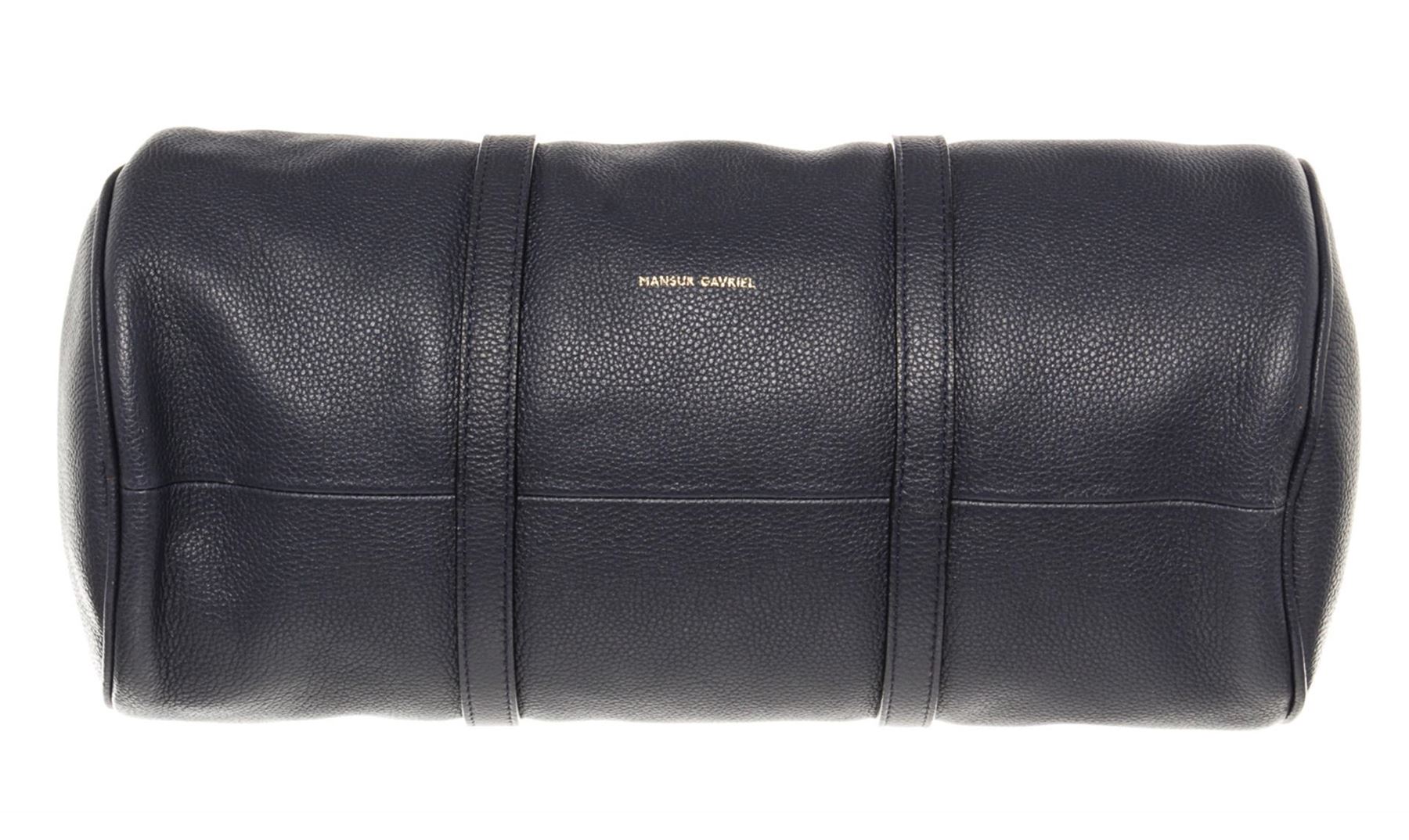 One Mansur Gavriel Navy Blue Lambskin Leather Mini Duffle Shoulder Bag. Item is sold AS-IS. All available information is listed in the description and shown in the photo. Mansur Gavriel Mini Duffle shoulder bag is crafted in navy blue Lambskin leather, gold-tone hardware, two top flat handles, two-way zip closure at top and black leather lining. 8.5" L x 4" W x 4" H, Handle Drop: 5"