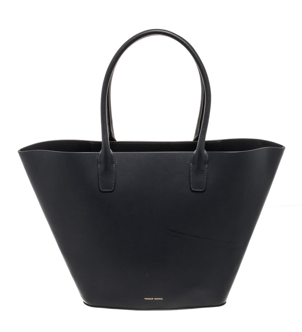 Mansur Gavriel Navy Blue Leather Triangle Handbag. All available information is listed in the description and shown in the photos. Mansur Gavriel Navy Blue Leather Triangle Handbag with Red Leather Interior, Inside Slip Pocket, Gold-tone Logo Embossed, Dual Leather Top Handles, and an Open Top. .