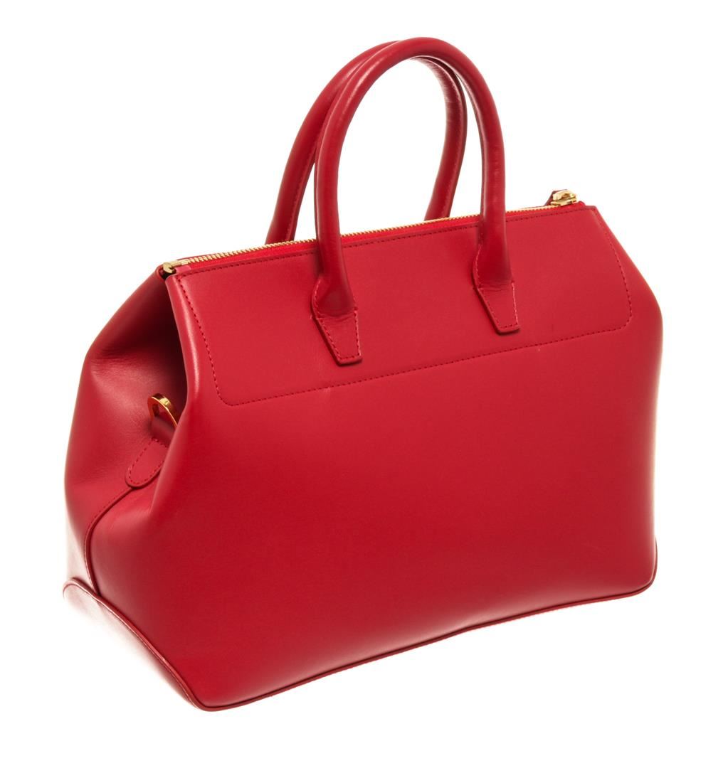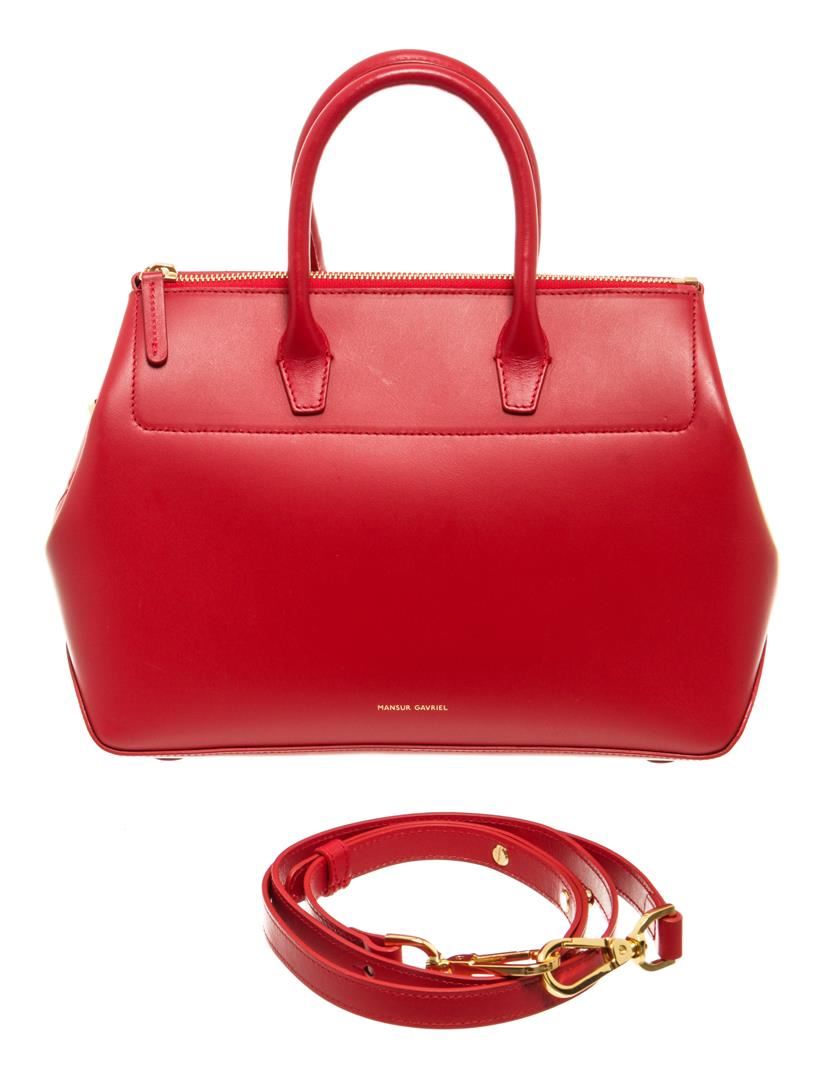 One Mansur Gavriel Red Leather Travel Handbag. Item is sold AS-IS. All available information is listed in the description and shown in the photo. Mansur Gavriel Red Leather Travel Handbag. Features gold hardware, red leather interior, red leather straps, and a gold zipper closure.