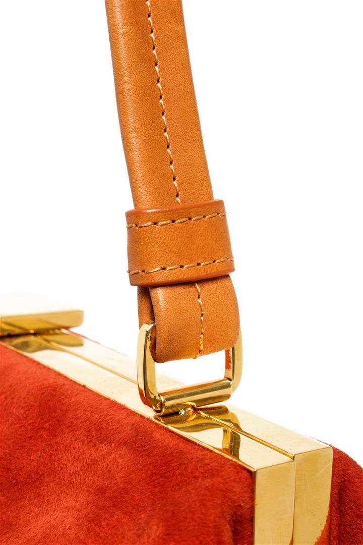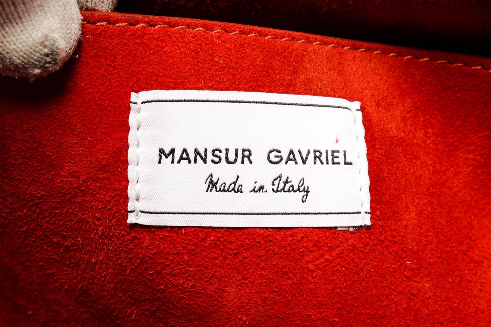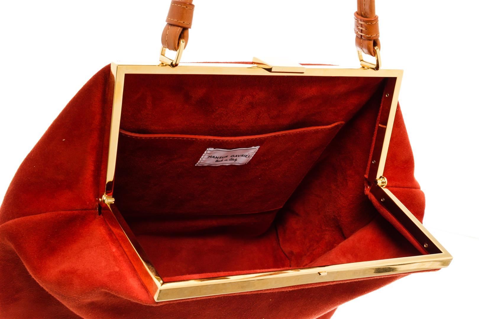 Mansur Gavriel Red Suede Soft Elegant Handbag. All available information is listed in the description and shown in the photos. Mansur Gavriel Red Suede Soft Elegant Handbag with gold-tone hardware, red suede lining, interior slip pocket, single leather top handle, and pushlock closure at the top. .