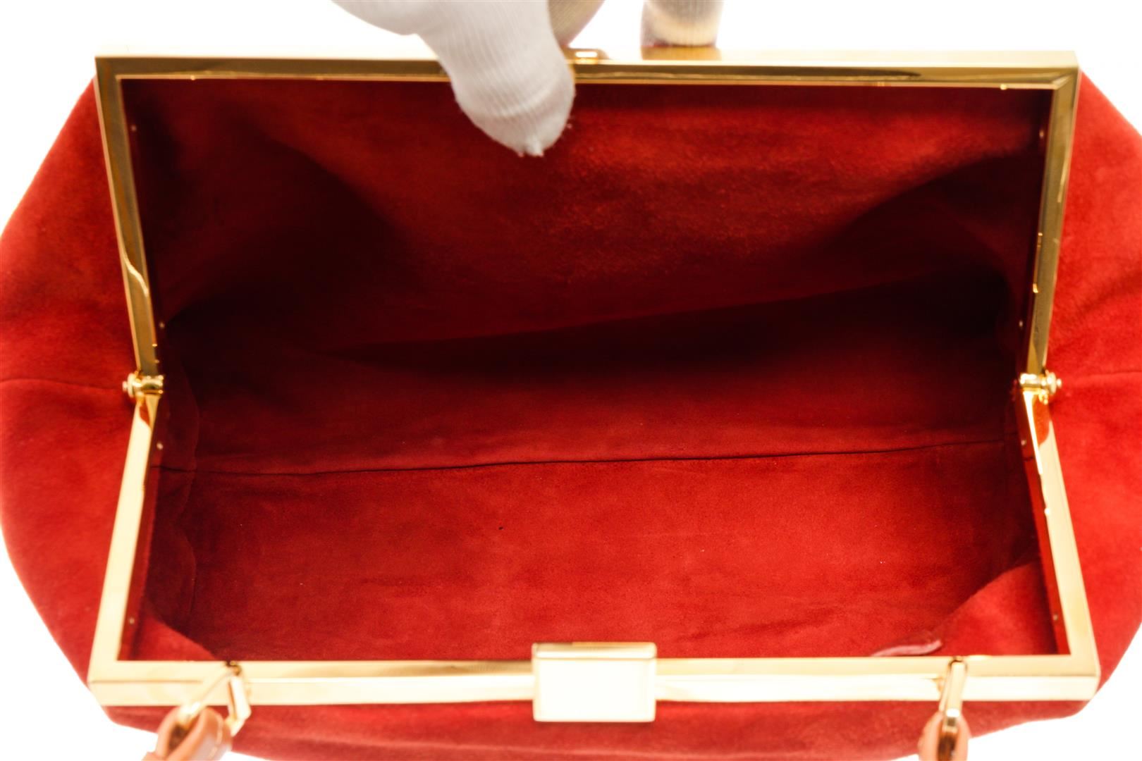 Mansur Gavriel Red Suede Soft Elegant Handbag. All available information is listed in the description and shown in the photos. Mansur Gavriel Red Suede Soft Elegant Handbag with gold-tone hardware, red suede lining, interior slip pocket, single leather top handle, and pushlock closure at the top. .