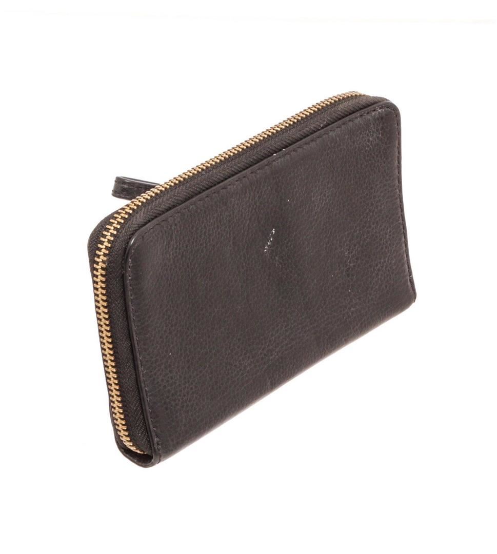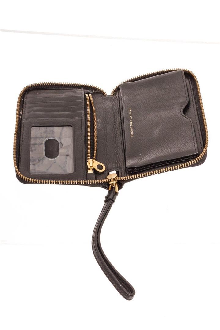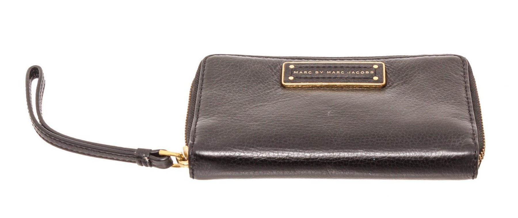 Marc By Marc Jacobs black leather Classic Q wristlet with gold-tone hardware, logo placard at front face, four interior pockets; one with zip closure, five card slots and overall zip around closure.