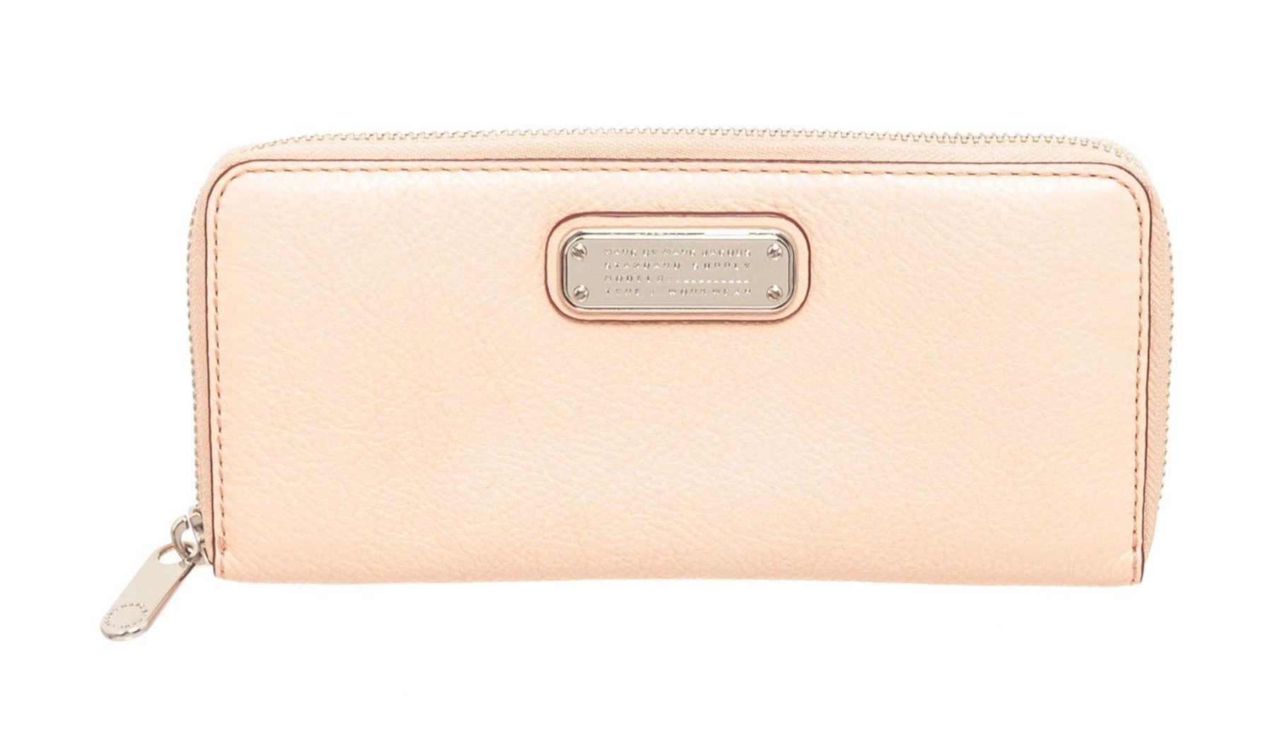 Marc By Marc Jacobs light pink leather Classic Q zippy wallet with silver-tone hardware, logo placard at front face, taupe leather interior lining, five interior compartments; one with zip closure, twelve card slots and overall zip around closure.