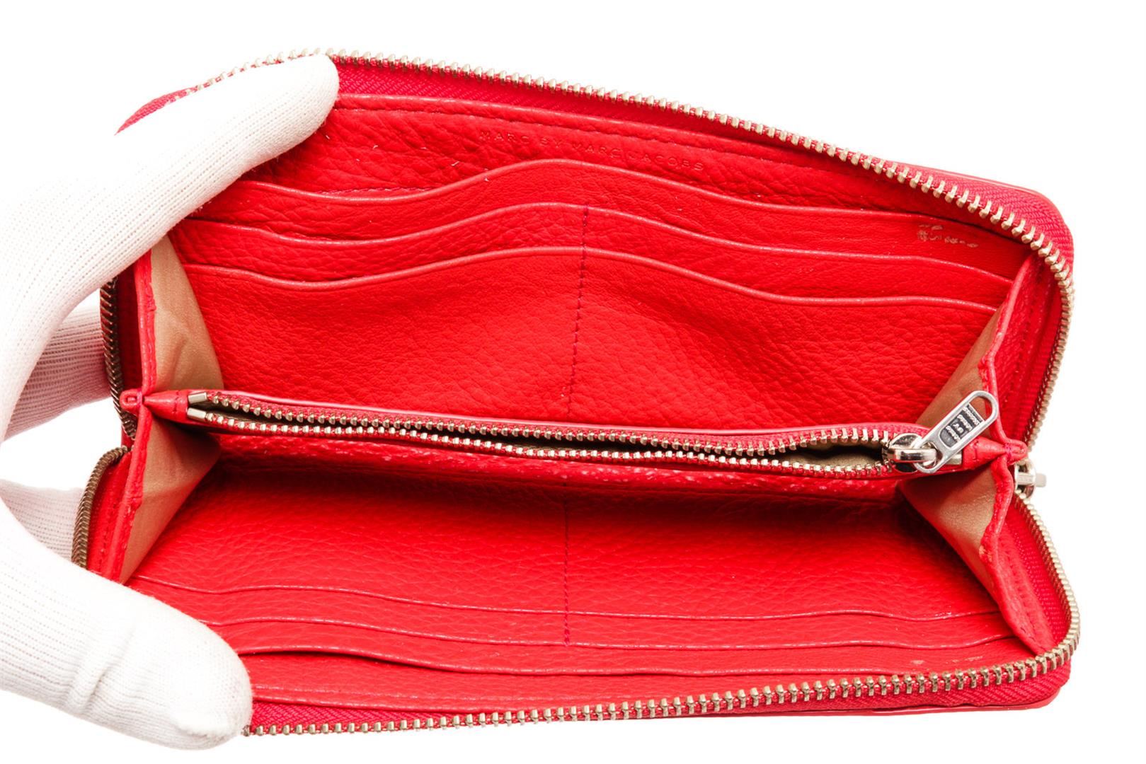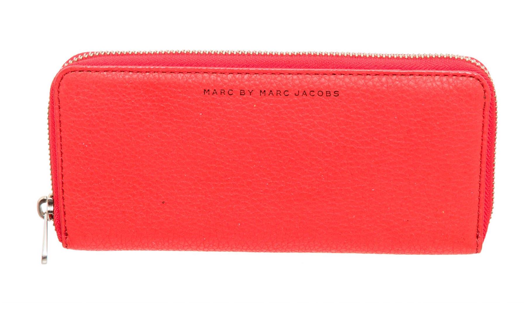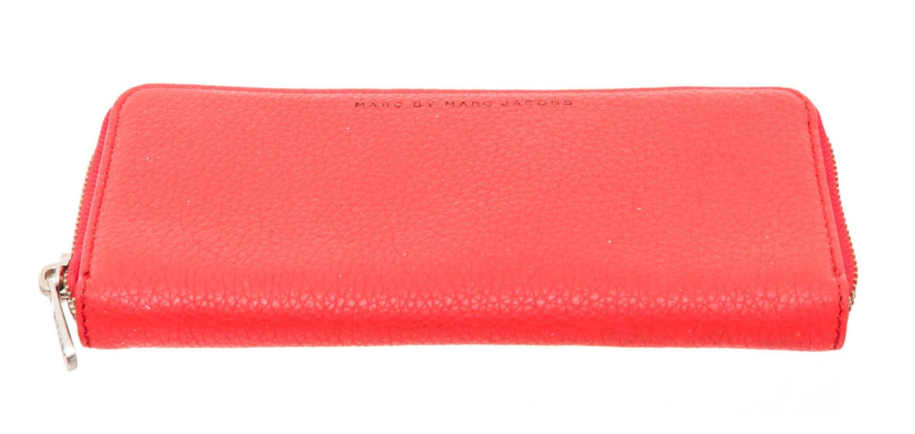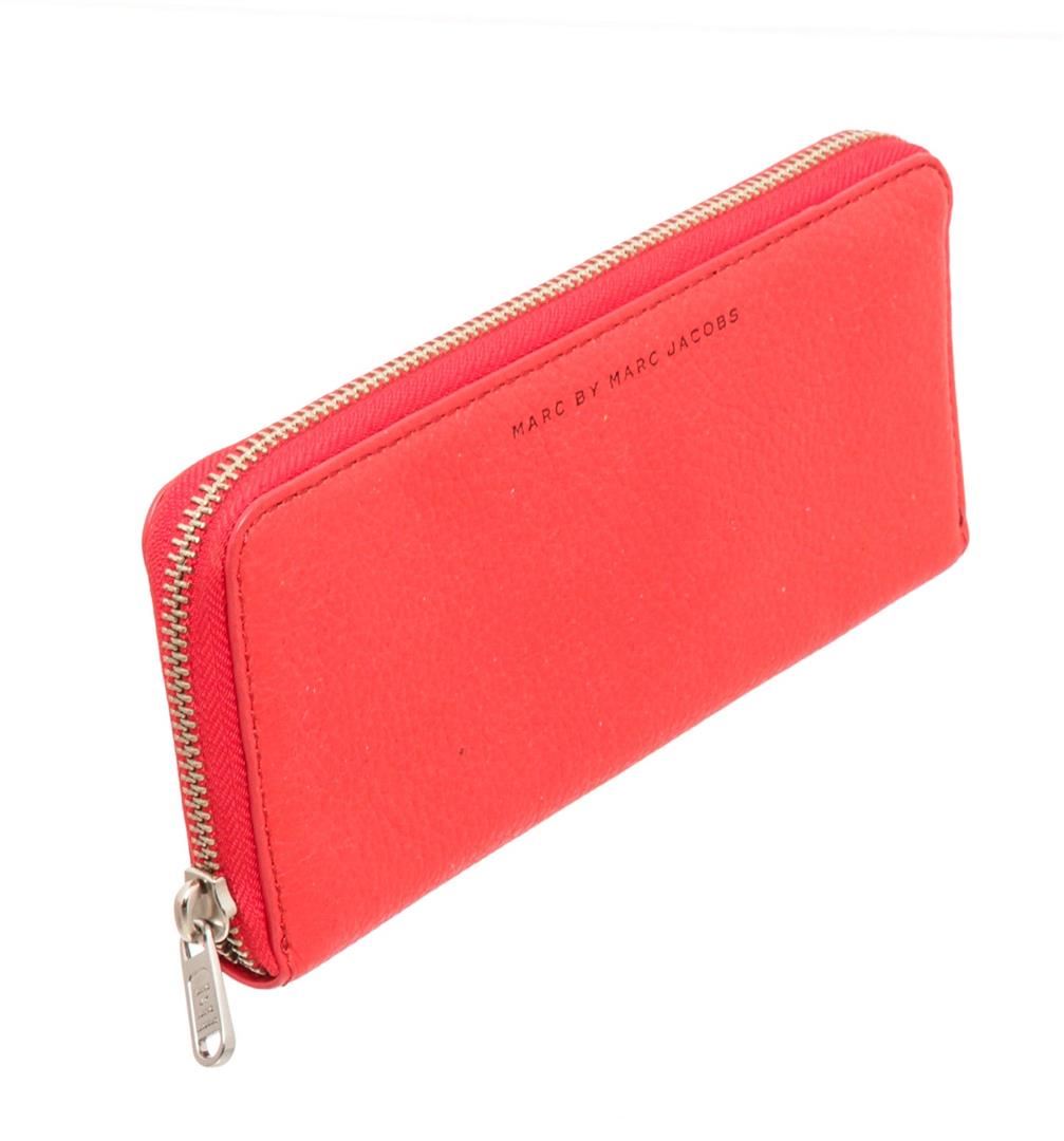 Marc By Marc Jacobs red leather zippy wallet with Silver-tone hardware, red leather interior lining, five interior pockets; one with zip closure, eight card slots and overall zip around closure.