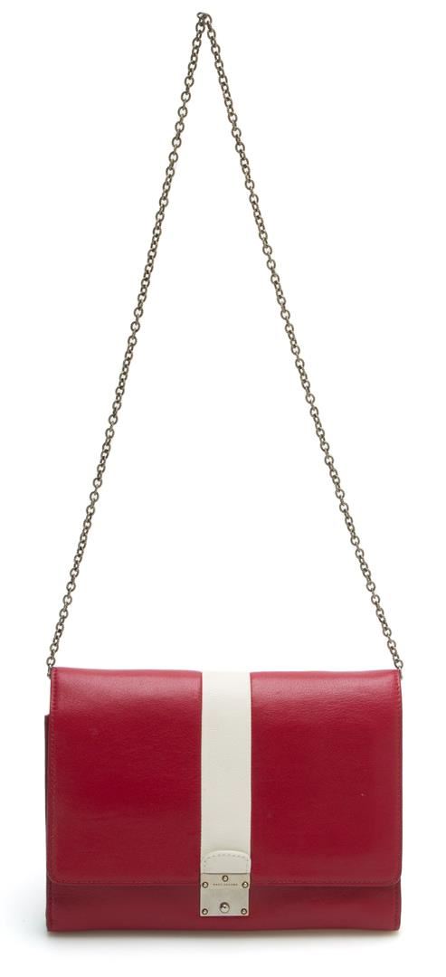This Marc Jacobs All in One clutch bag features wallet-like qualities with plenty of card slots and a convenient interior mirror. Patent leather with golden hardware. Removable chain shoulder strap; 16 1/2" drop. Fold-over flap; push-lock clasp. Opens to reveal vanity mirror and I.D. slot at interior flap. Leather lining; central zip compartment and sixteen card slots. 7"H x 9"W x 2 1/2"D. Made in Italy. This is a brand new bag.