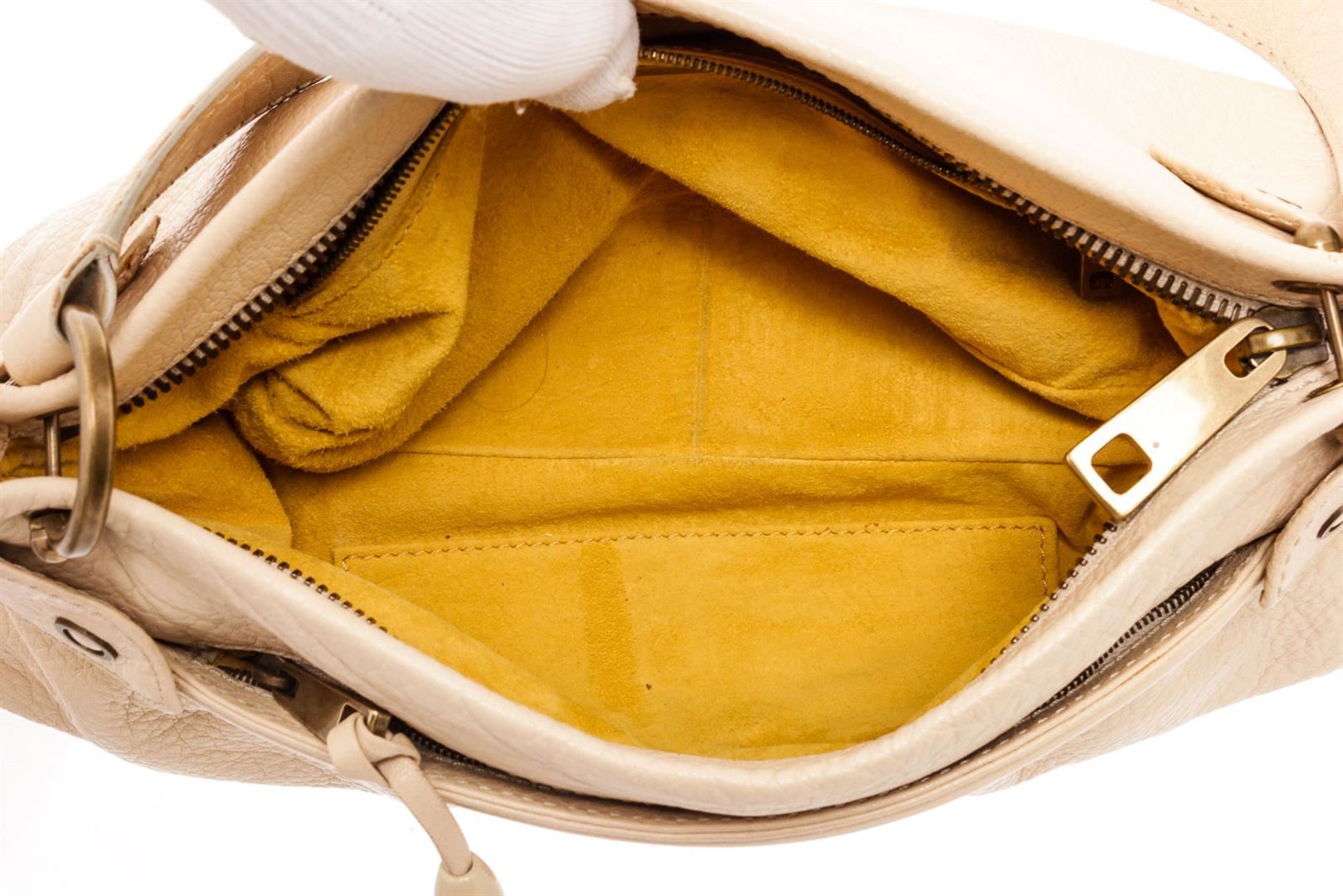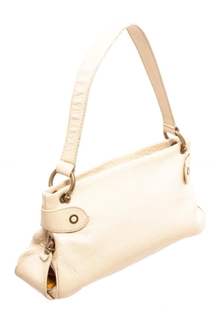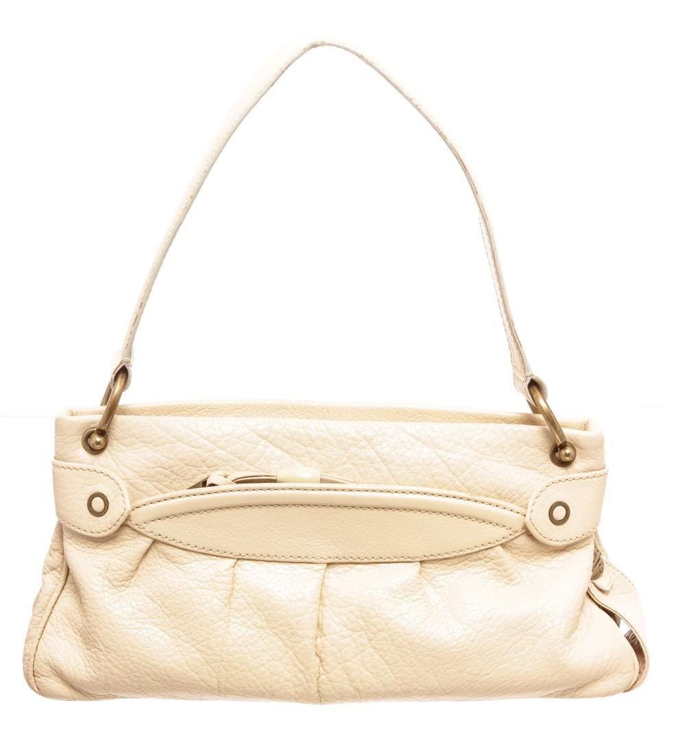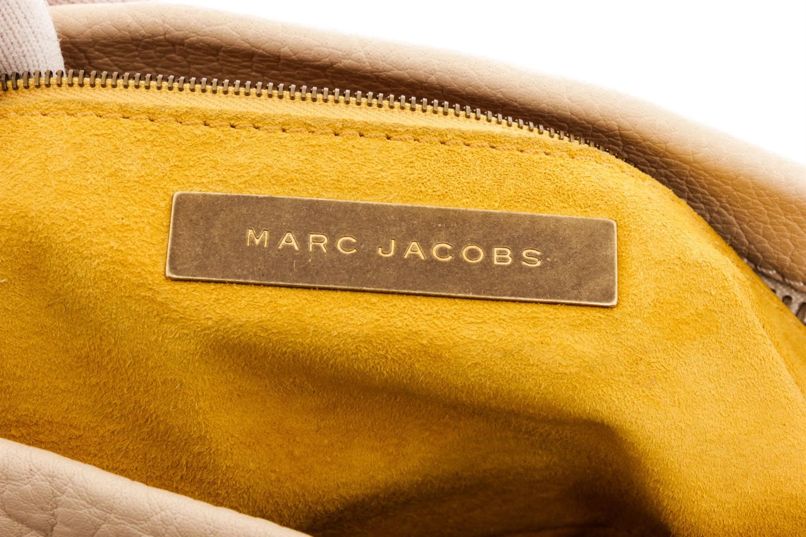 Marc Jacobs Cream Leather Shoulder Bag with gold-tone hardware, interior zip pockets, suede lining, leather shoulder strap, and zipper closure.