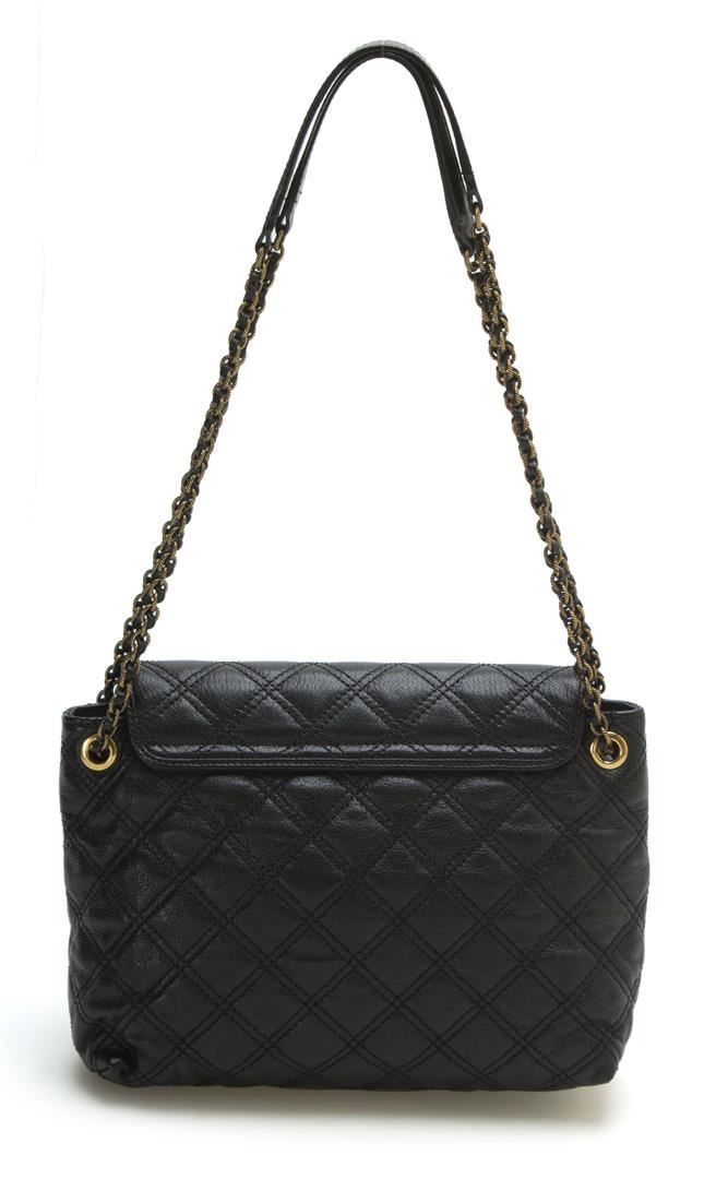 The Large Single bag from Marc Jacobs' Baroque collection. Quilted lambskin in black. Bag features: top-flap with hammered silver lock, shoulder-chain in embossed metal and braided leather. Cotton-lined with two inside pockets, one zipped. DIMENSIONS : H8"x W10"xD4".MATERIAL:Leather. Shoulder chain. Two interior pockets. This is a brand new bag.
