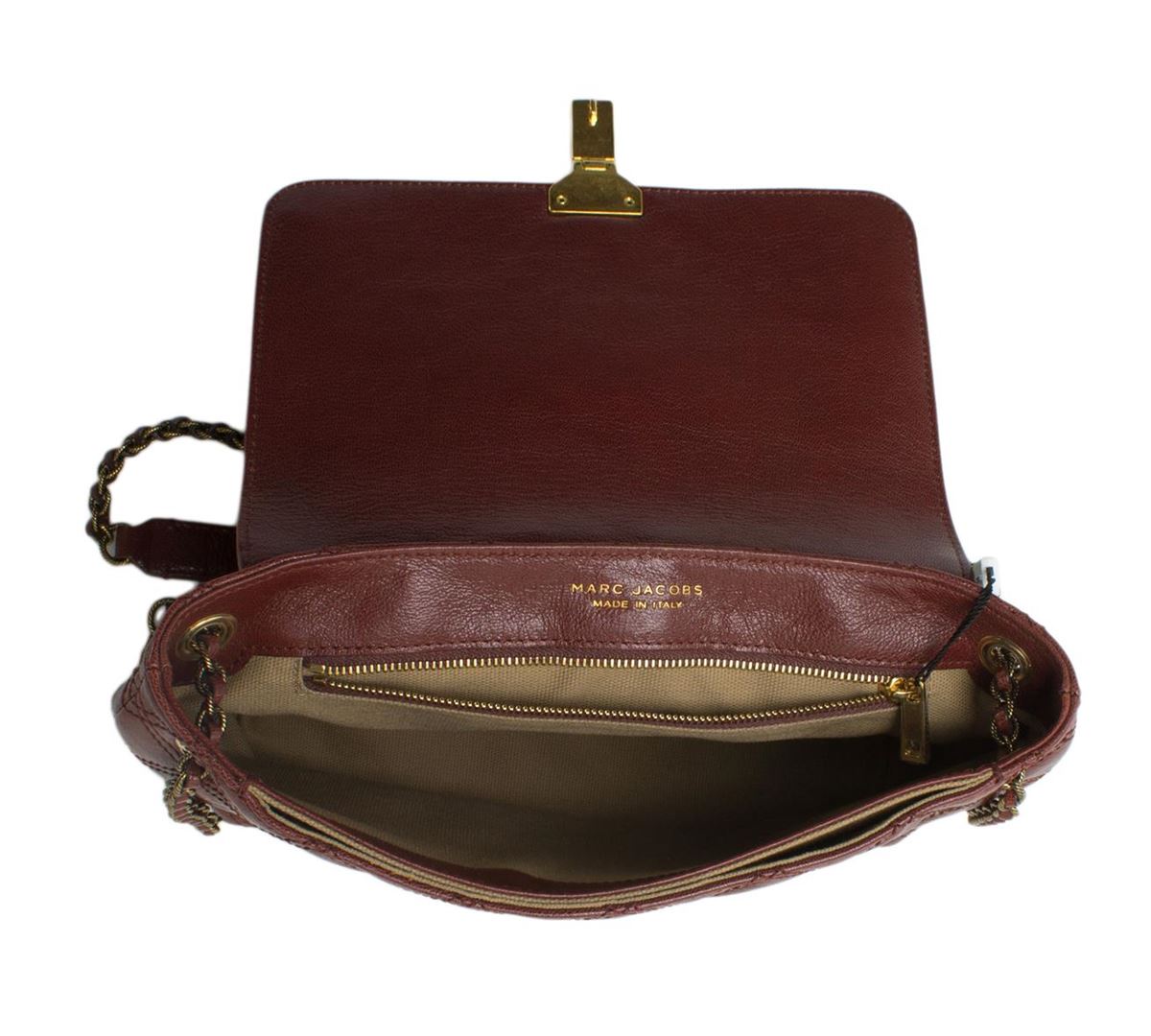 The Large Single bag from Marc Jacobs' Baroque collection. Quilted lambskin in black. Bag features: top-flap with hammered silver lock, shoulder-chain in embossed metal and braided leather. Cotton-lined with two inside pockets, one zipped. DIMENSIONS : H8"x W10"xD4".MATERIAL:Leather. Shoulder chain. Two interior pockets. This is a brand new bag.