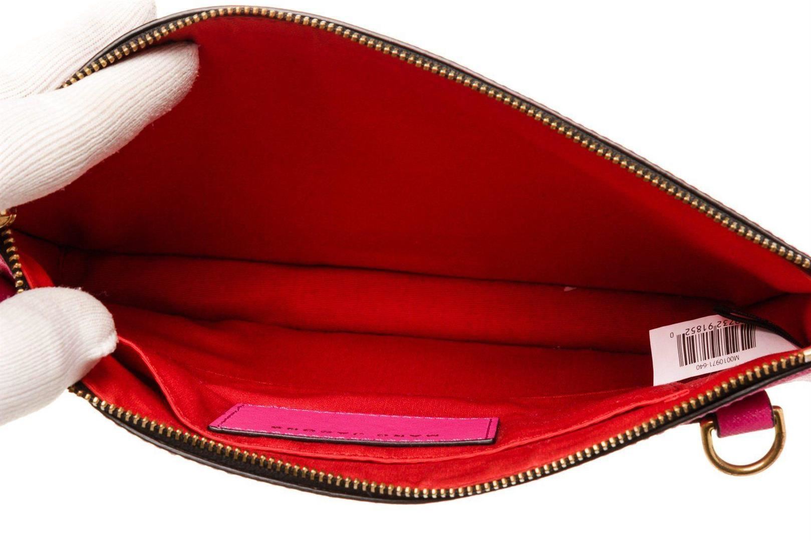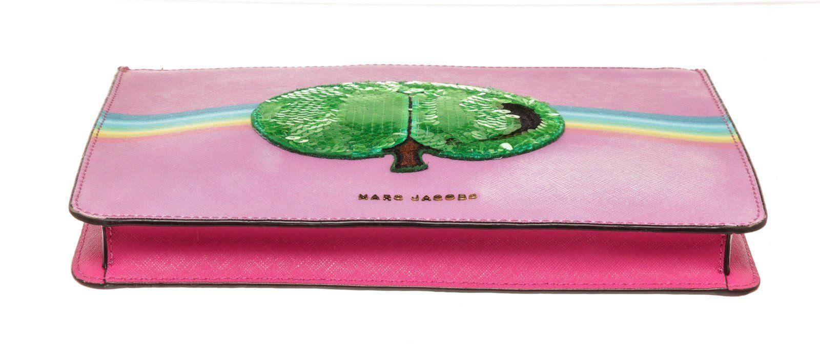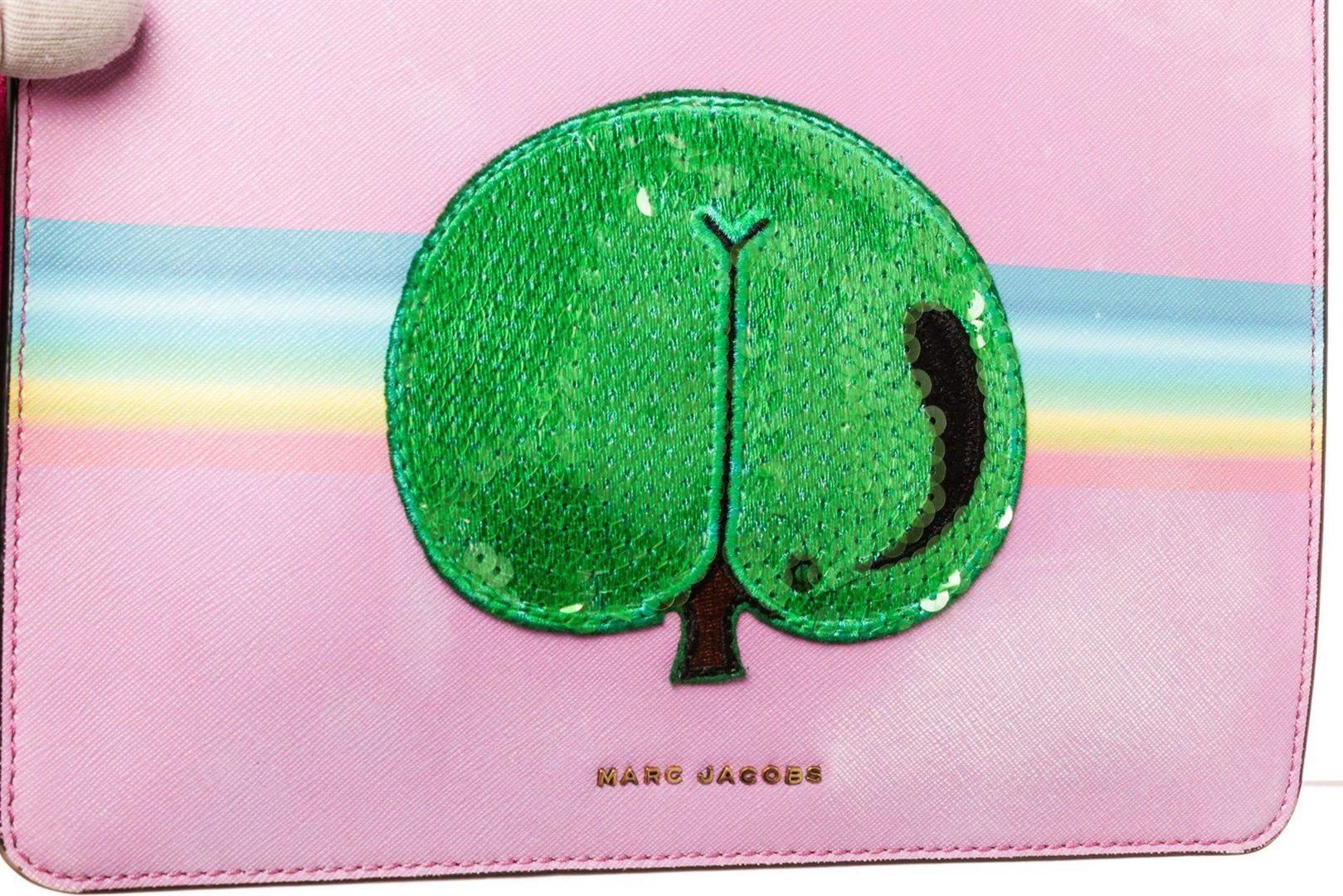 Marc Jacobs Pink Leather Crossbody Bag with leather, gold-tone hardware, single exterior pockets, interior three pockets, canvas lining, adjustable shoulder strap, and snap closure.