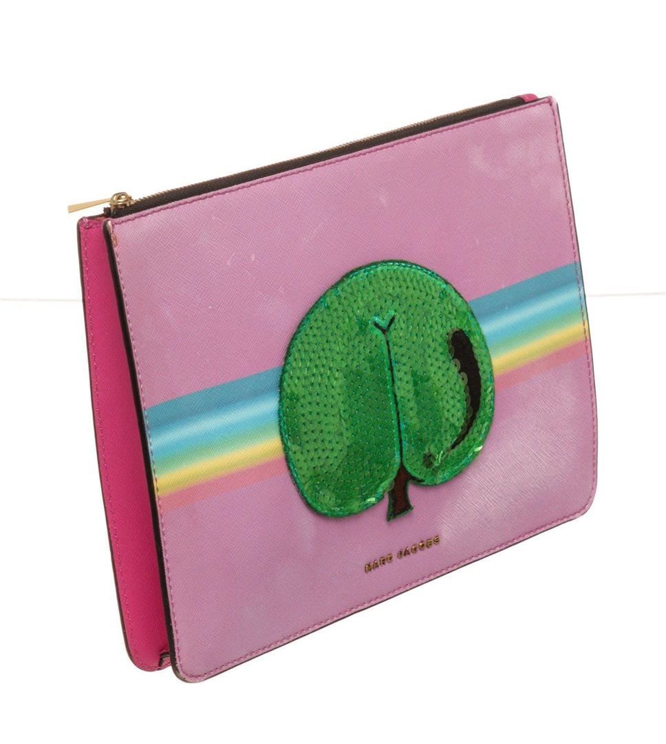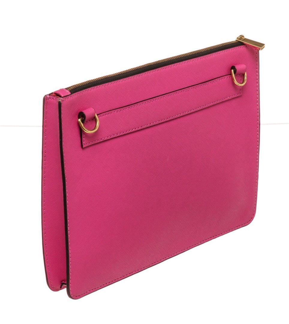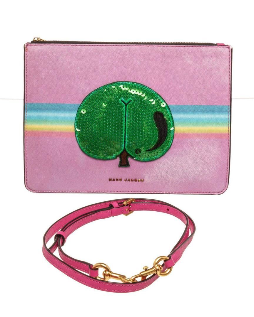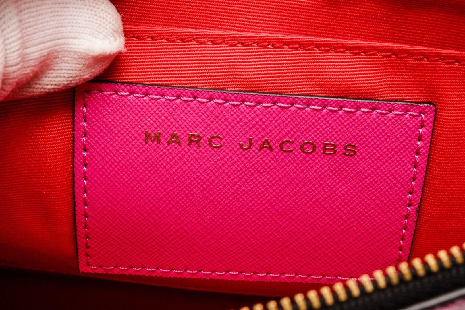 Marc Jacobs Pink Leather Crossbody Bag with leather, gold-tone hardware, single exterior pockets, interior three pockets, canvas lining, adjustable shoulder strap, and snap closure.
