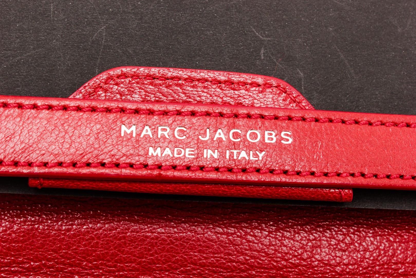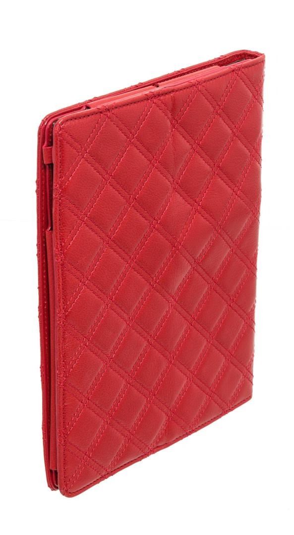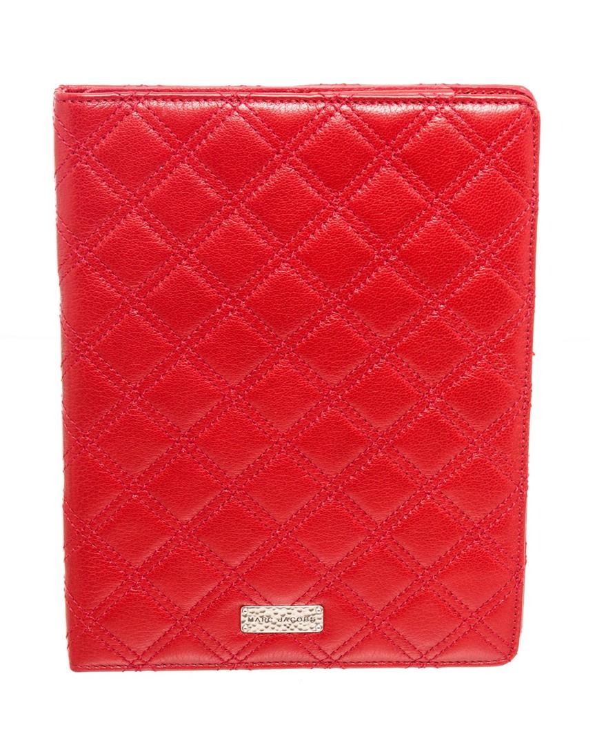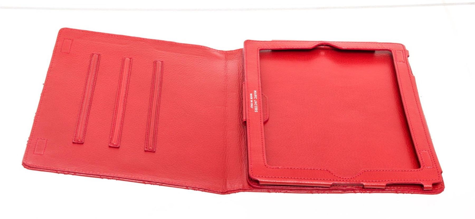 Marc Jacobs red tufted leather tablet case with silver-tone hardware, logo placard at front, red leather interior lining, tablet holder pocket and overall bifold closure.